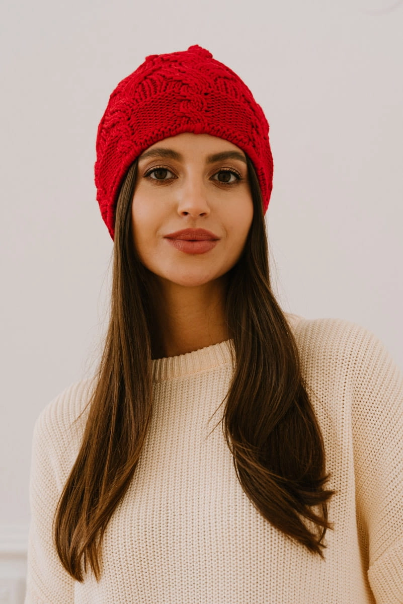 Czapka z warkoczem czerwona, wełniana – ciepła czapka na jesienne chłody