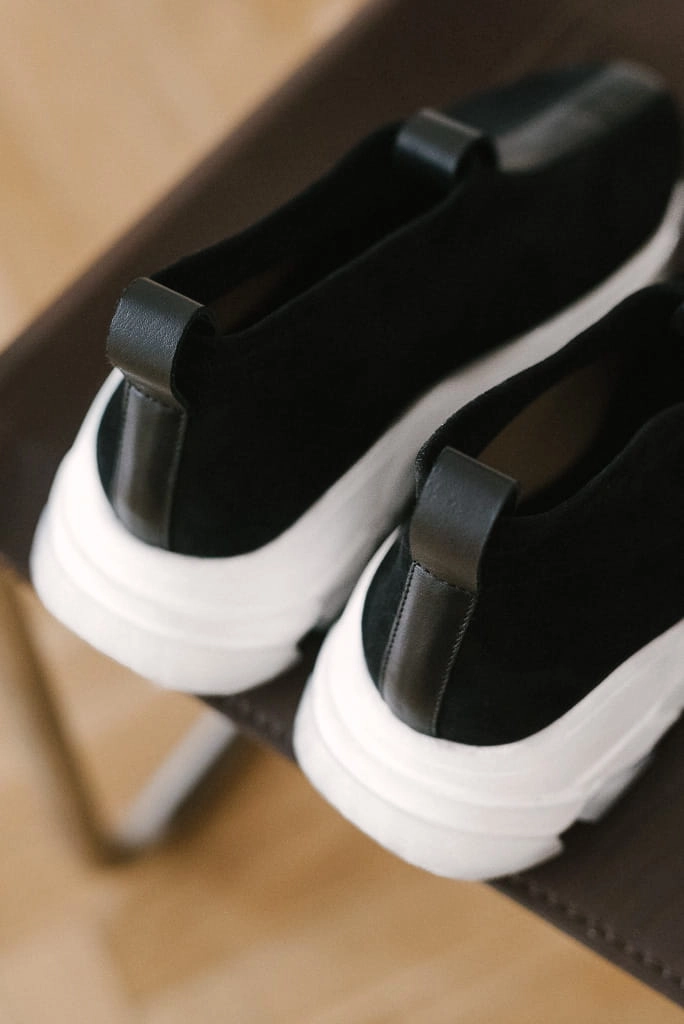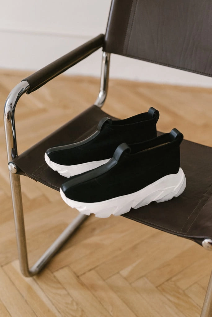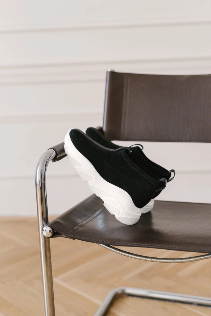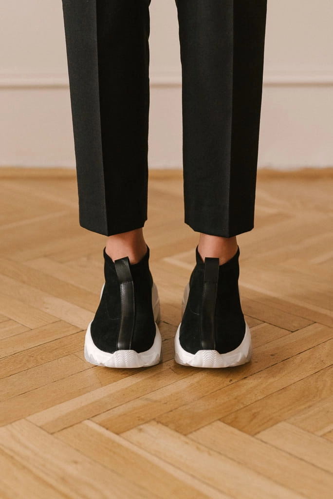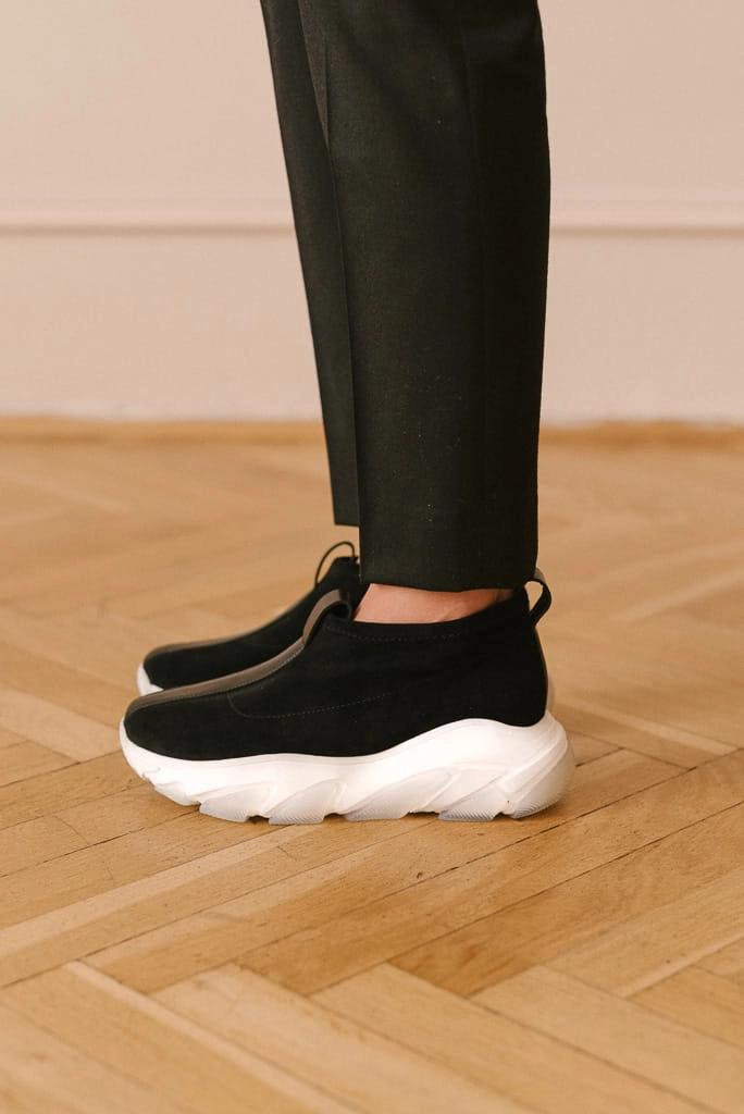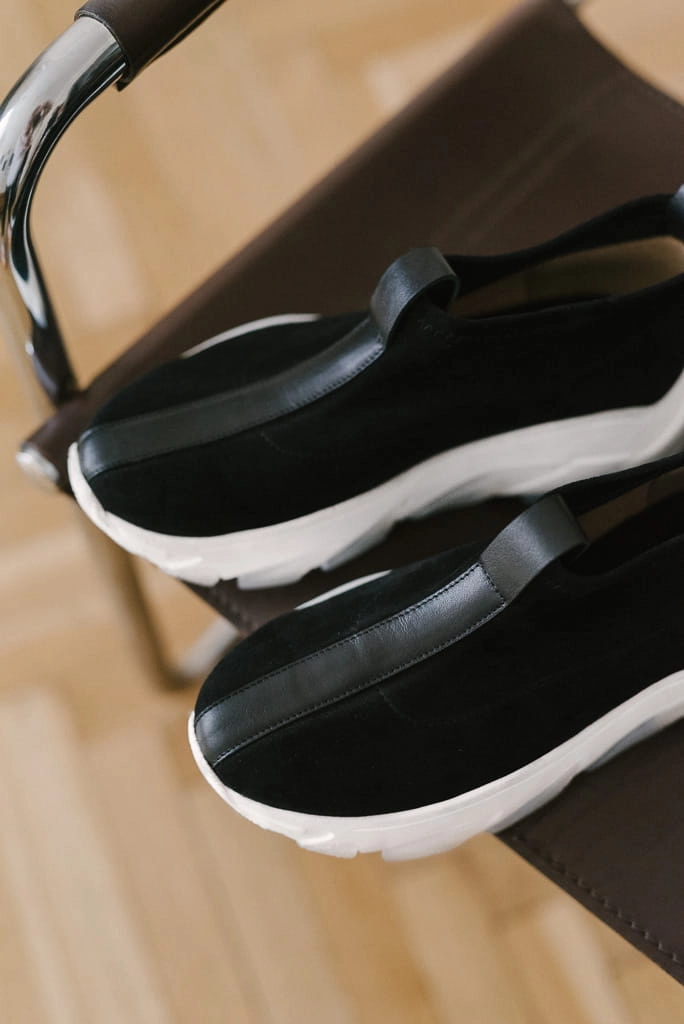 Inspirowaliśmy się kopytem Audrey, dodaliśmy sportową podeszwę i wykończyliśmy lampasami inspirowanymi męski smokingiem. Ten styl to totalny eklektyzm w czarno-białej kolorystyce. Na wierzchu Audrey są wykonane z lycry. Podszycie cholewki wewnątrz to podszewka ze skóry naturalnej. Natomiast wyściółkę butów wykonaliśmy z wełny owczej, więc stopa się nie spoci. Dodatkowo umieściliśmy również pas ze skóry naturalnej.
