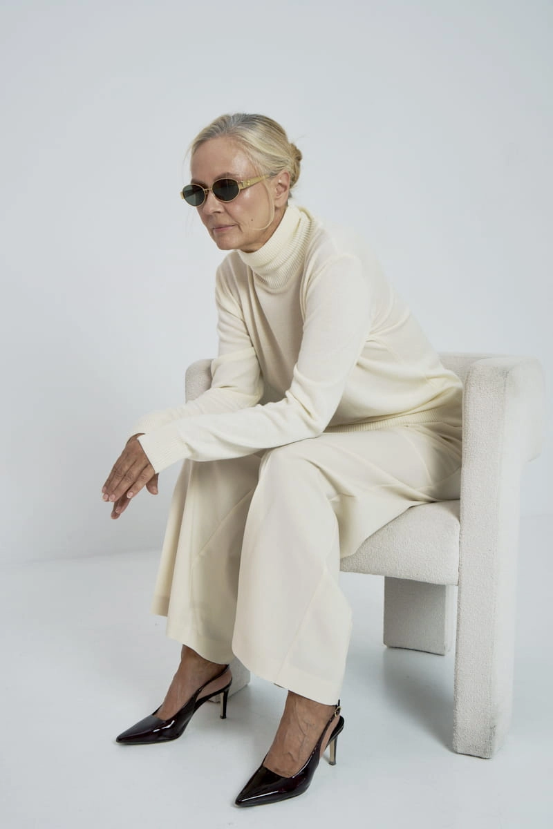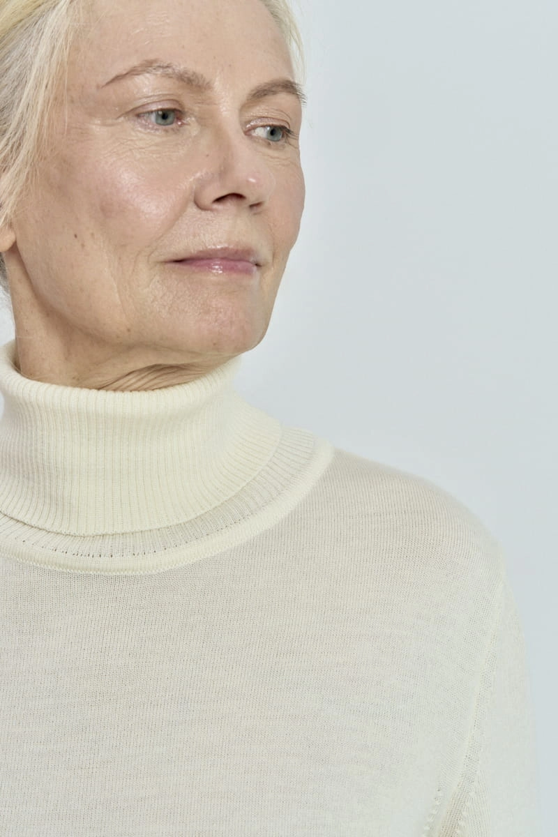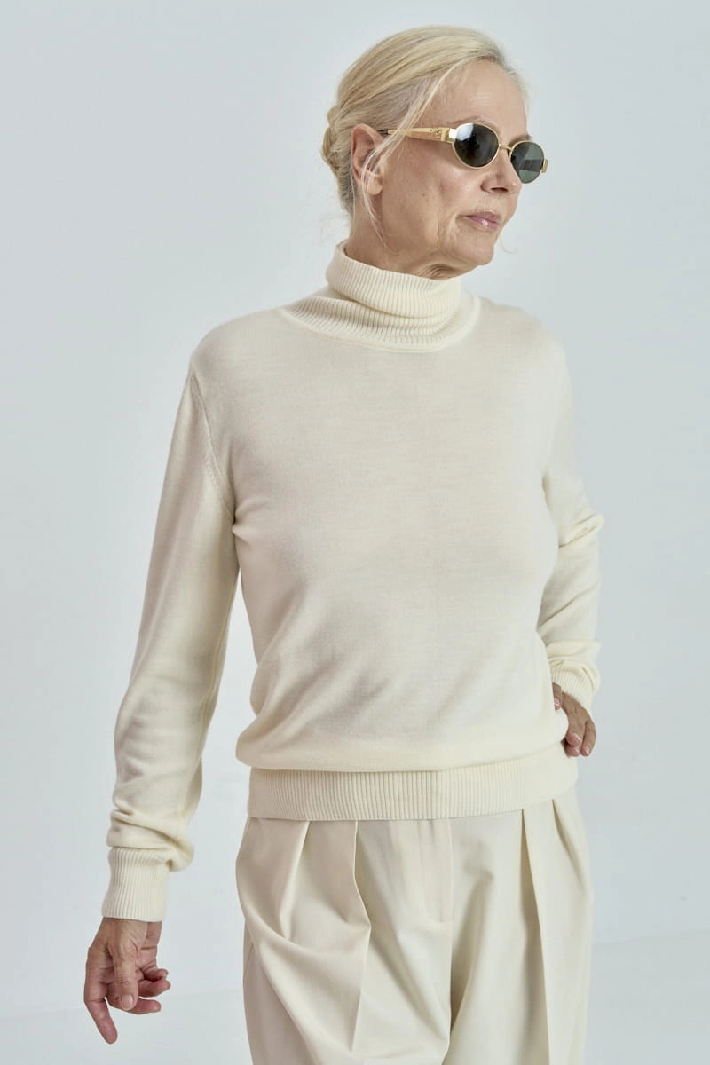 Model ten posiada długie rękawy zakończone delikatnie prążkowanym ściągaczem, który zapewnia komfort noszenia dodając przy tym wyrafinowanego wyglądu. Otulający golf chroni przed chłodem, tworząc przytulną barierę przed zimowym wiatrem, a jednocześnie stanowi stylowy akcent, który można łatwo komponować z innymi elementami garderoby.