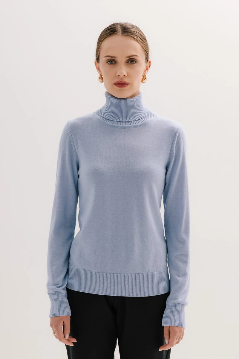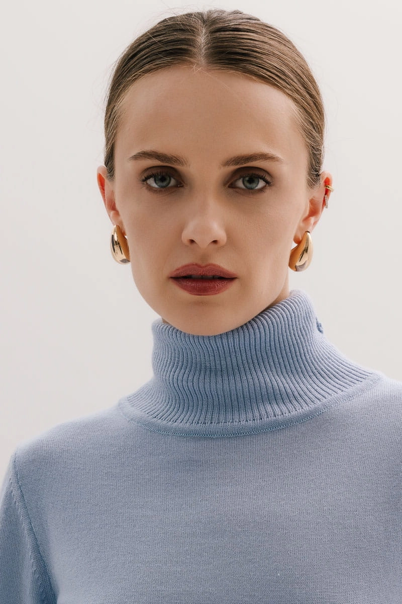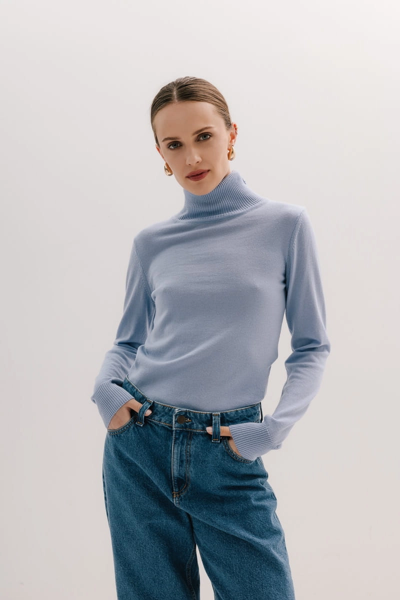 Model ten posiada długie rękawy zakończone delikatnie prążkowanym ściągaczem, który zapewnia komfort noszenia dodając przy tym wyrafinowanego wyglądu. Otulający golf chroni przed chłodem, tworząc przytulną barierę przed zimowym wiatrem, a jednocześnie stanowi stylowy akcent, który można łatwo komponować z innymi elementami garderoby.