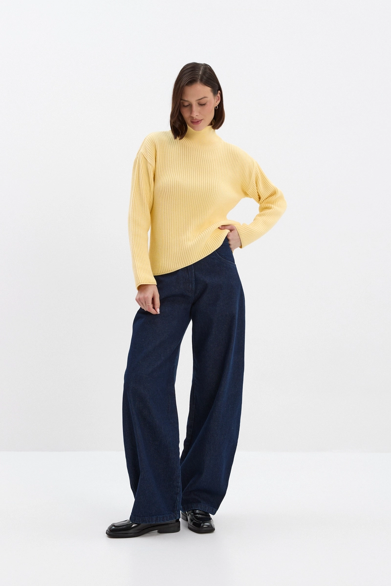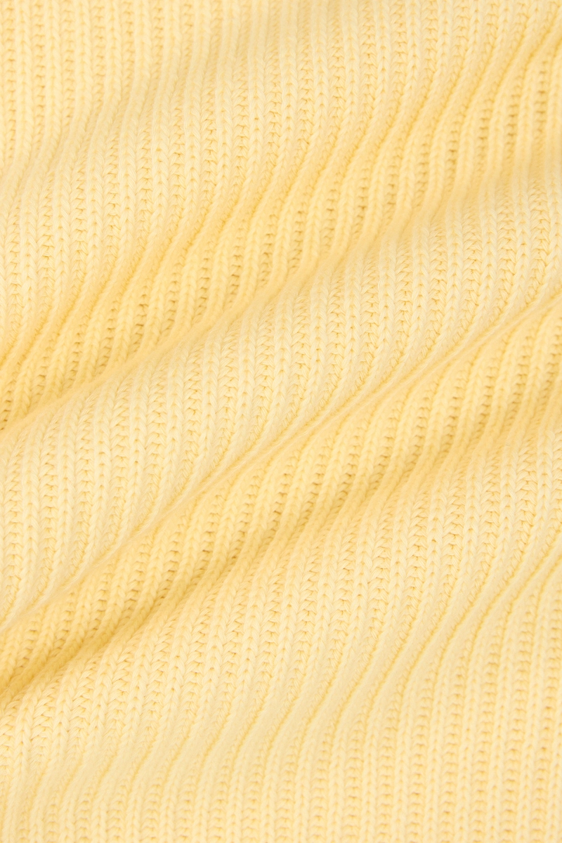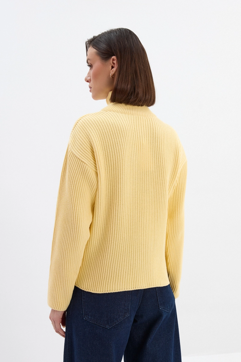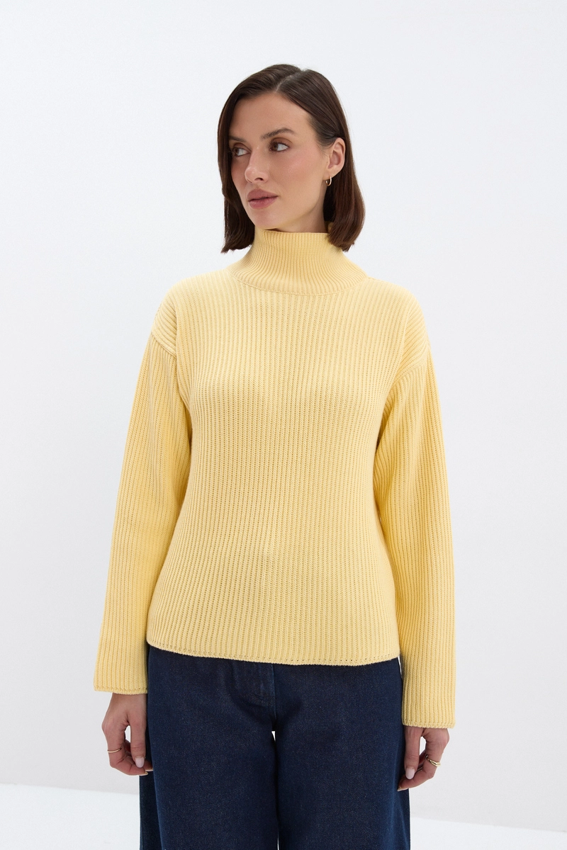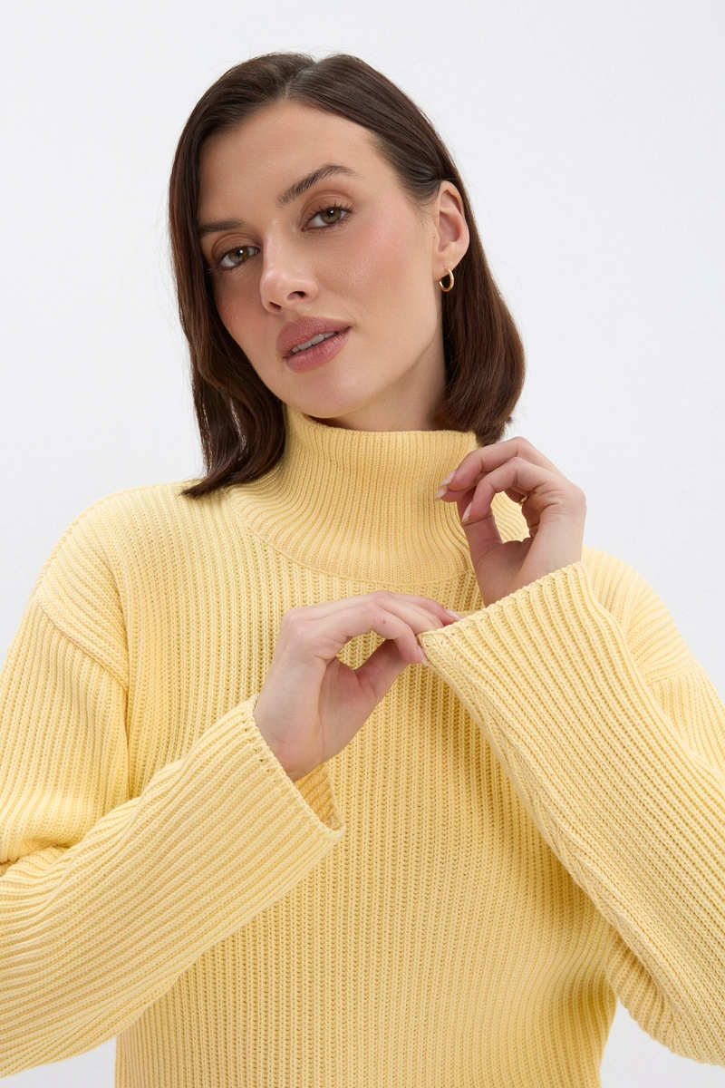 Klasyczny sweter z wysokim golfem w ciepłym, masełkowym kolorze z delikatnym prążkiem. Wysoka gramatura materiału gwarantuje ciepło i trwałość, a charakterystyczny splot nadaje całości wyrazistej faktury, która ożywia nawet najprostsze stylizacje.