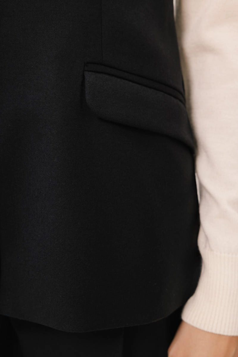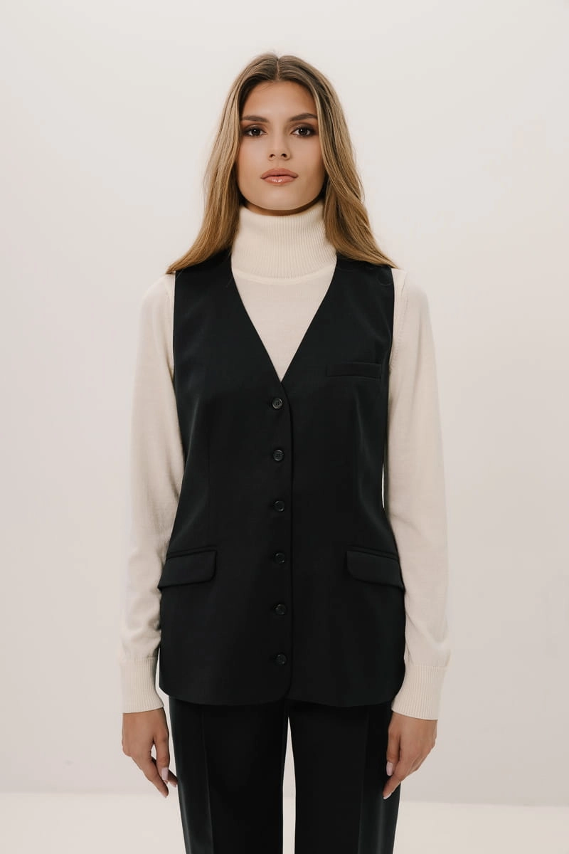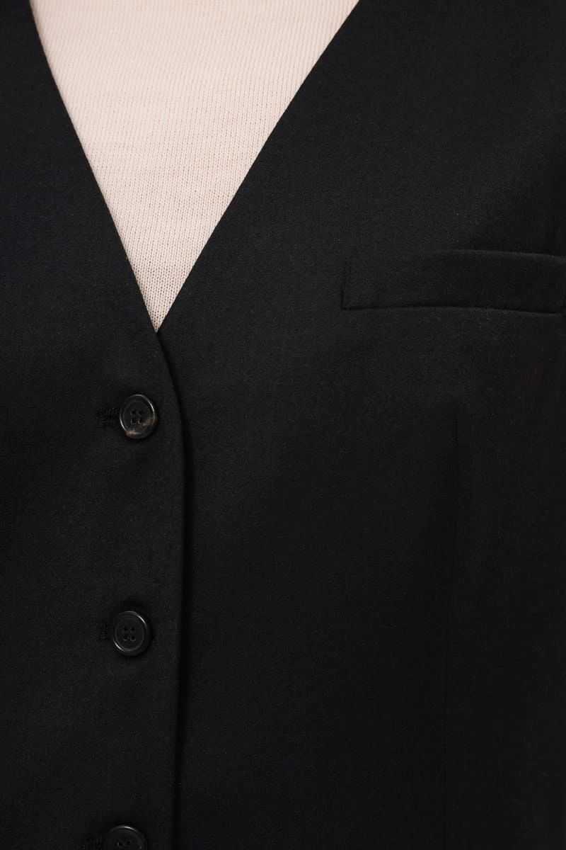 Przód kamizelki zdobi sześć starannie dobranych guzików, które podkreślają jej klasyczny charakter i dodają wyrafinowanego uroku każdej stylizacji. Subtelne dwie kieszenie z klapkami są eleganckim akcentem, który łączy w sobie funkcjonalność z estetyką, dodając całości niepowtarzalnego stylu.