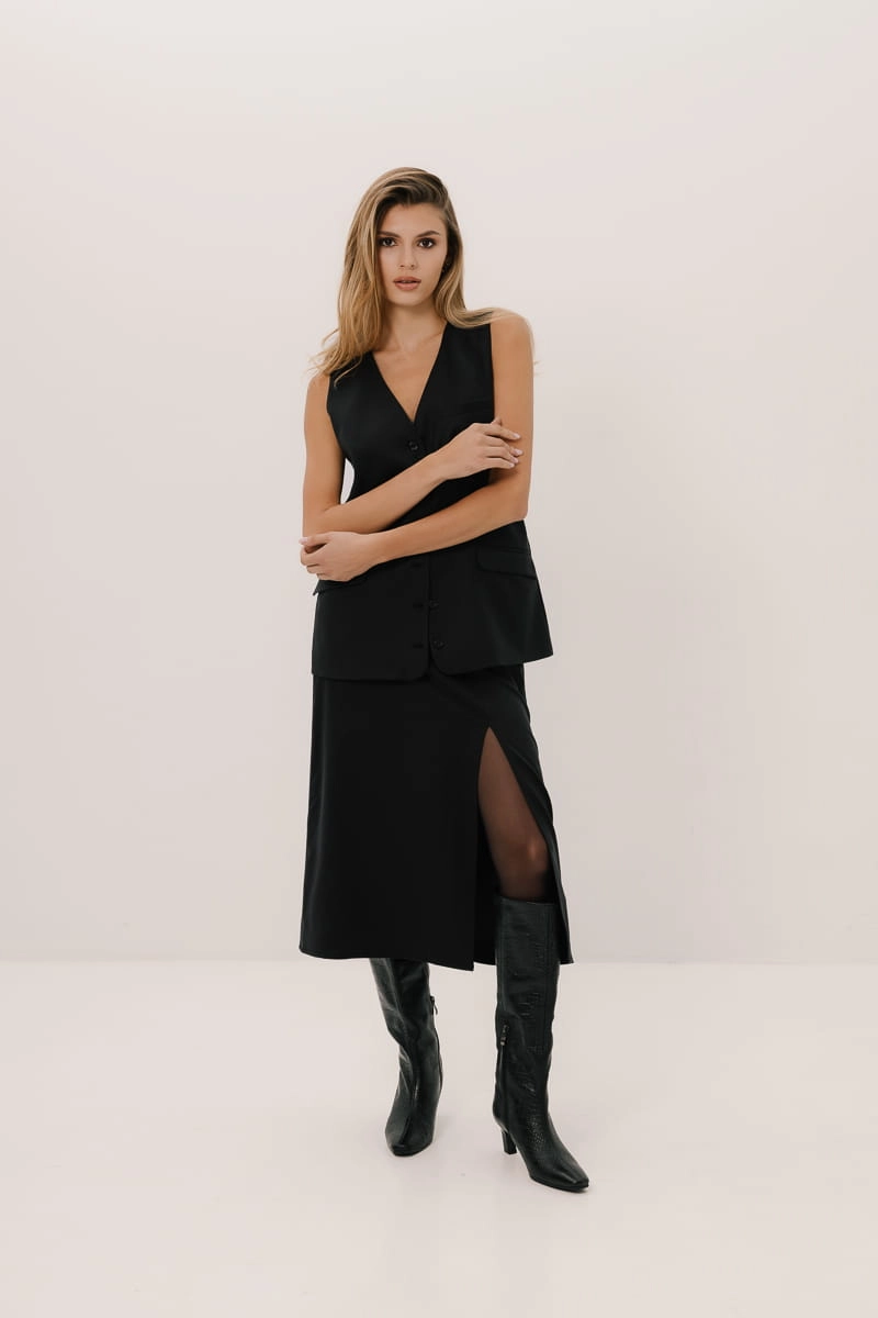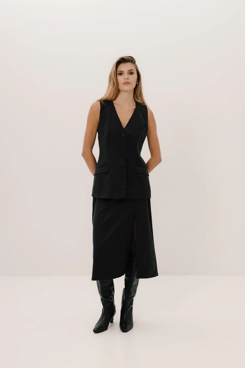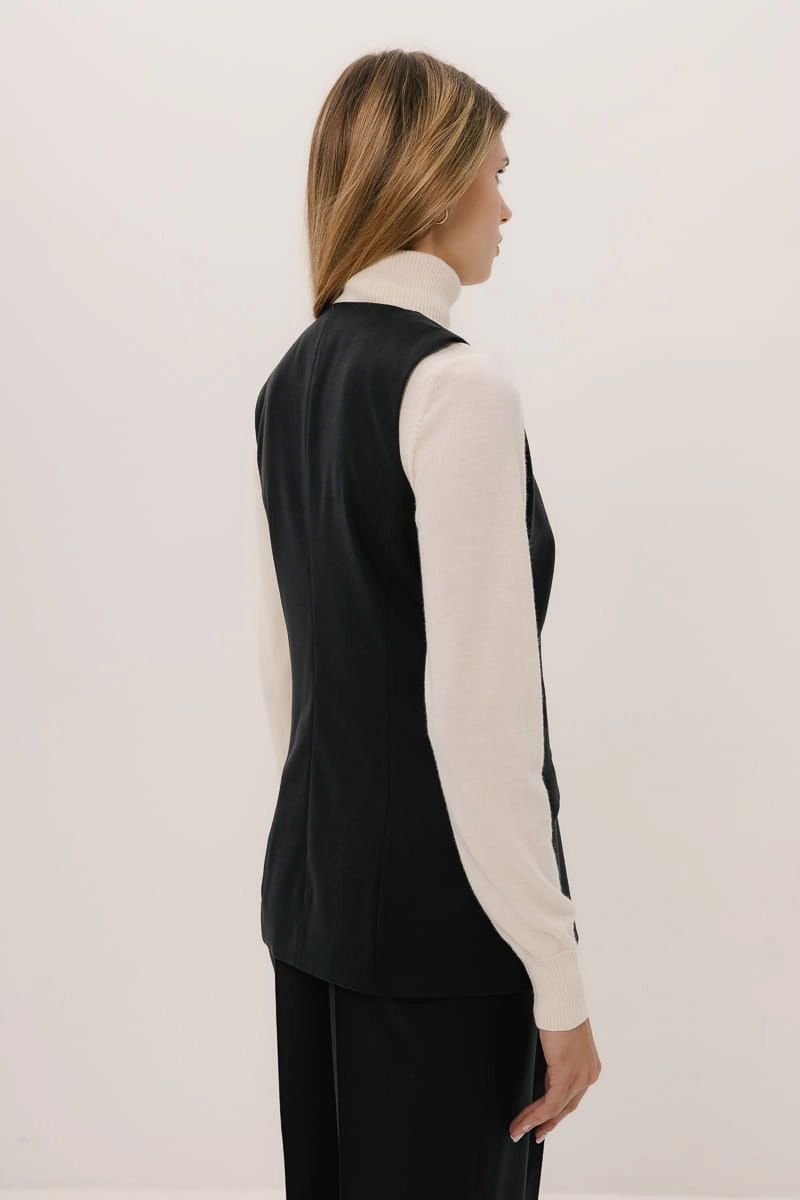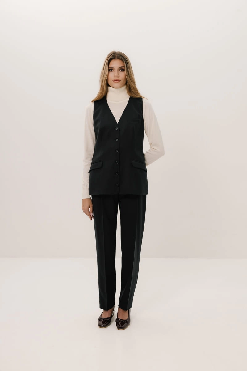 Przód kamizelki zdobi sześć starannie dobranych guzików, które podkreślają jej klasyczny charakter i dodają wyrafinowanego uroku każdej stylizacji. Subtelne dwie kieszenie z klapkami są eleganckim akcentem, który łączy w sobie funkcjonalność z estetyką, dodając całości niepowtarzalnego stylu.