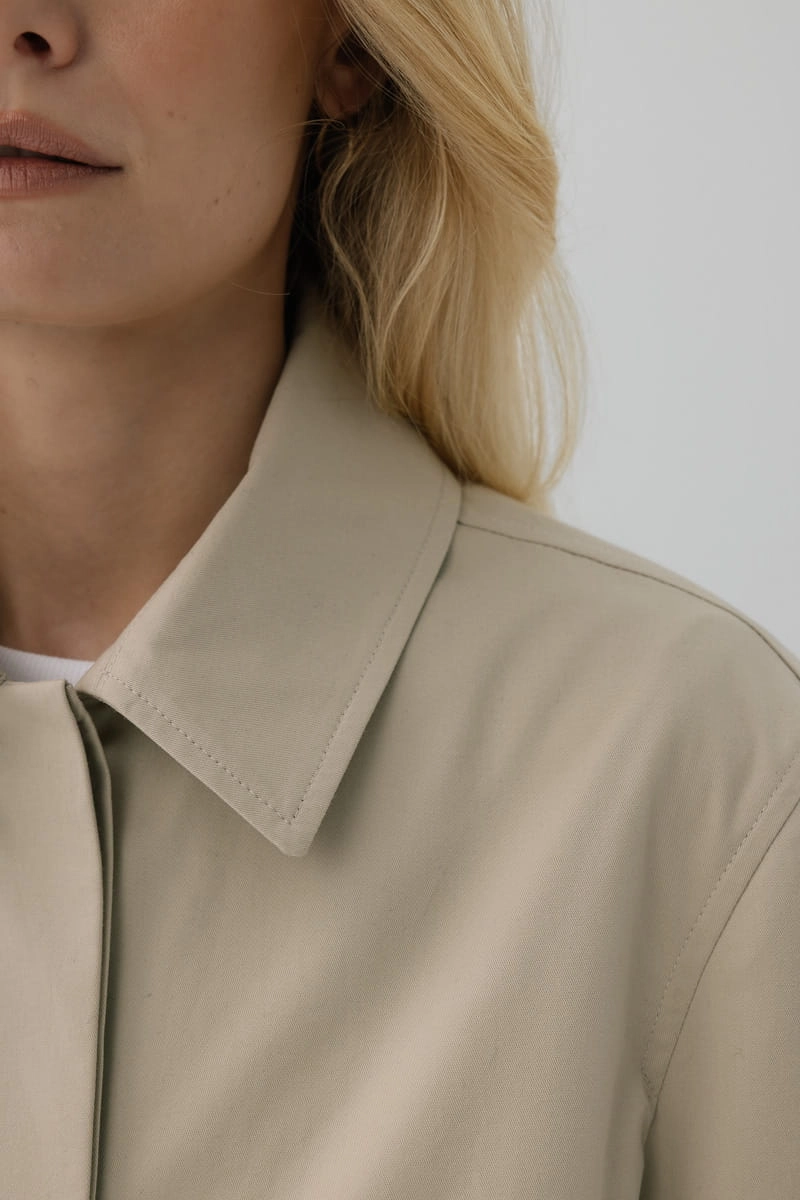 Poznaj naszą bawełnianą kurtkę z kołnierzykiem na wiskozowej podszewce! Jej luźny krój i miękki materiał gwarantują wygodę przez cały dzień, a subtelne zapięcie z krytą plisą podkreśla elegancki charakter. Rzadko spotykane, jasne guziki rogowe sprawiają, że całość zyskuje unikatowy akcent przyciągający spojrzenia. Dzięki uniwersalnemu fasonowi kurtka świetnie komponuje się zarówno z jeansami, jak i bardziej klasycznymi stylizacjami, a boczne kieszenie zapewniają dodatkową funkcjonalność. Postaw na ponadczasowy design i doświadcz wygody w wyjątkowym stylu.
