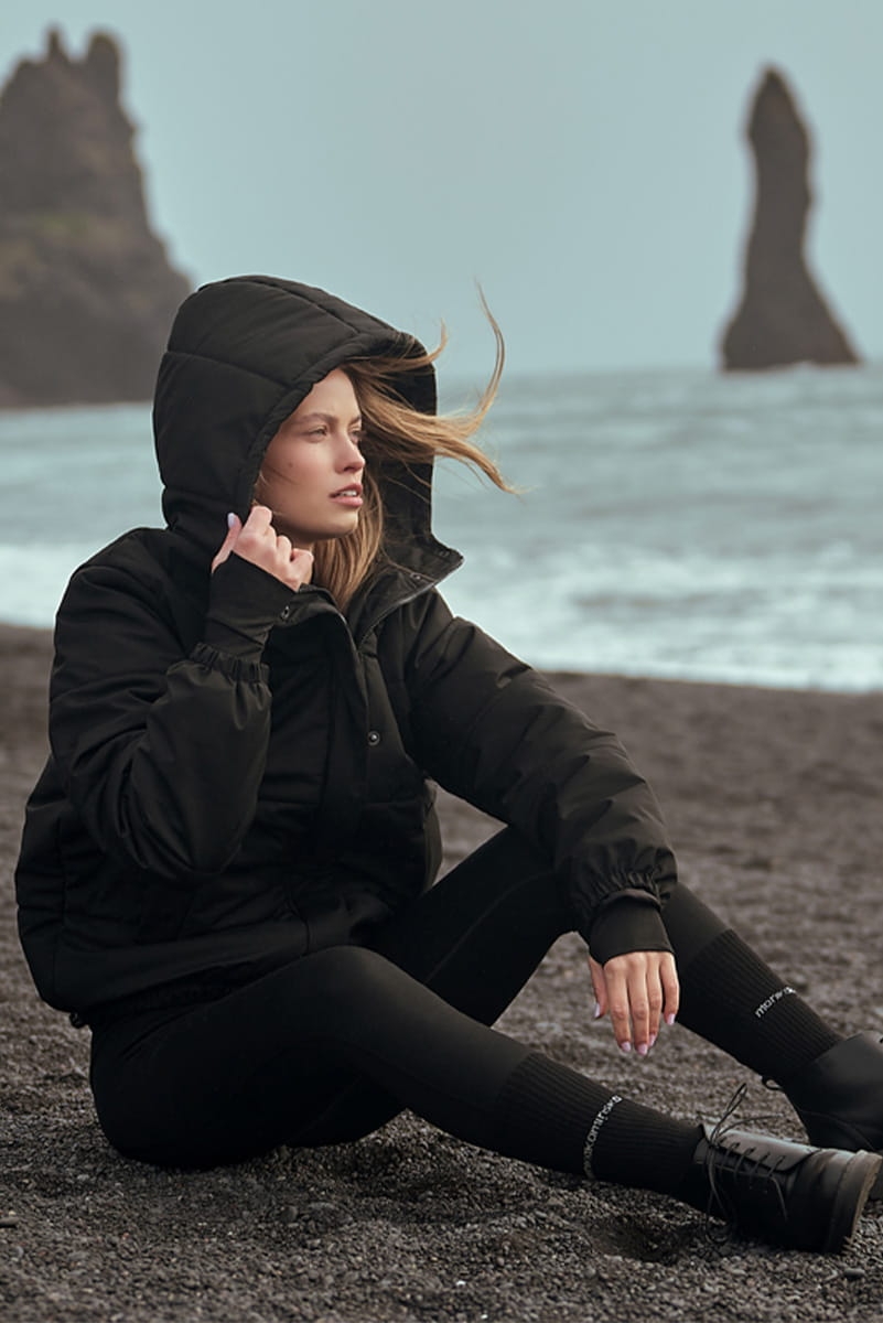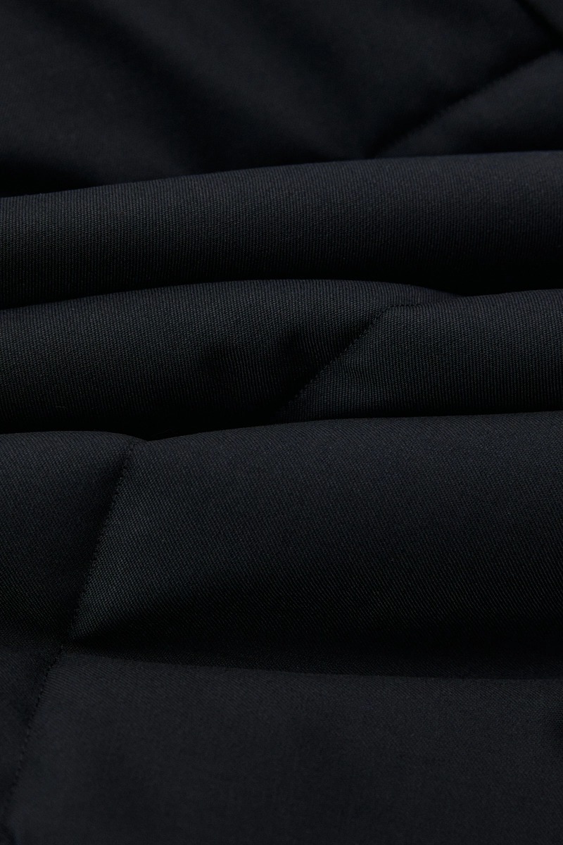 - Skład: tkanina wierzchnia: 100% wełna + membrana 10 mikronów z recyklingu; wypełnienie: 80% wełna merino; 20% biopolimer włókna kukurydzianego; podszewka: 100% wiskoza;