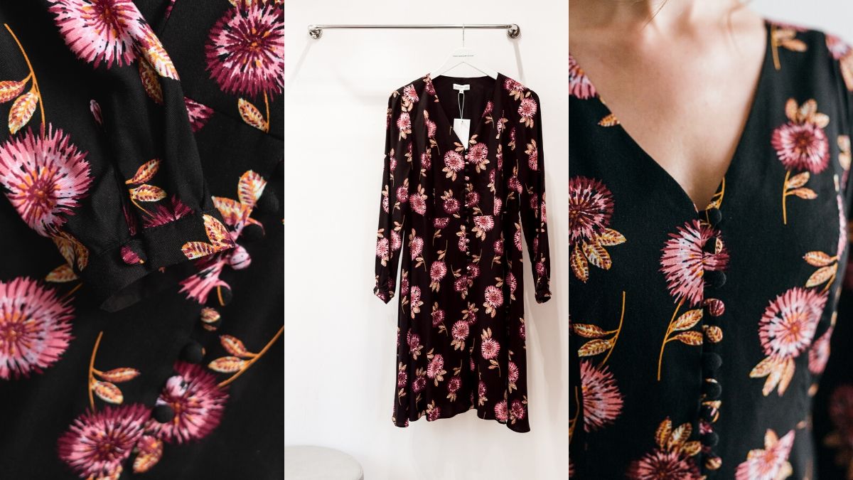 W przypadku naszej sukienki Meghan Dress w kwiaty takim akcent pada na guziki. A w sumie to raczej aż 22 akcenty, ponieważ tyle guzików posiada sukienka. Guziki są subtelnie oblekane i zapinane na pętelkę. Zaczynają się przy dekolcie i schodzą w dół sylwetki, więc dzięki temu optycznie są wysmuklają.