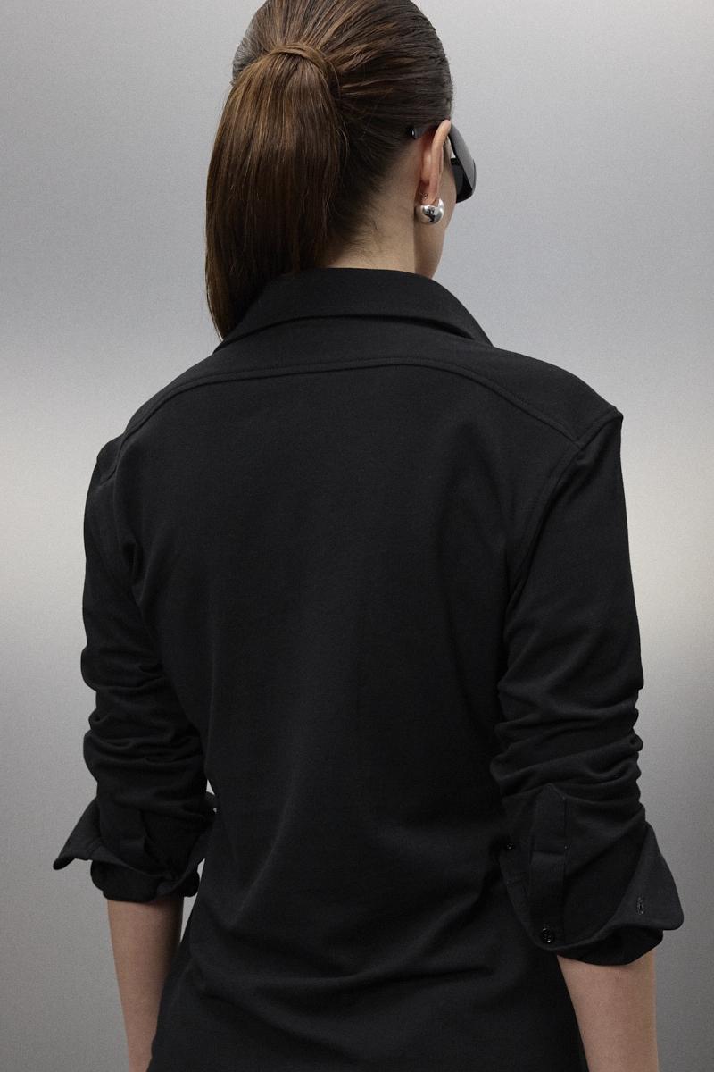 Model ma kołnierzyk z plisą zapinaną na perłowe guziki, a mankiety również wykończono guzikami. Z tyłu znajduje się odcinany karczek, który poprawia układanie się materiału na plecach i utrzymuje konstrukcję w codziennym noszeniu. Całość została zaprojektowana jako funkcjonalny, prosty model o dopracowanych detalach.
