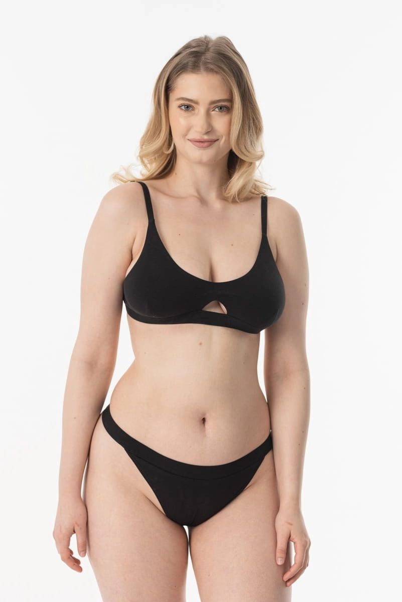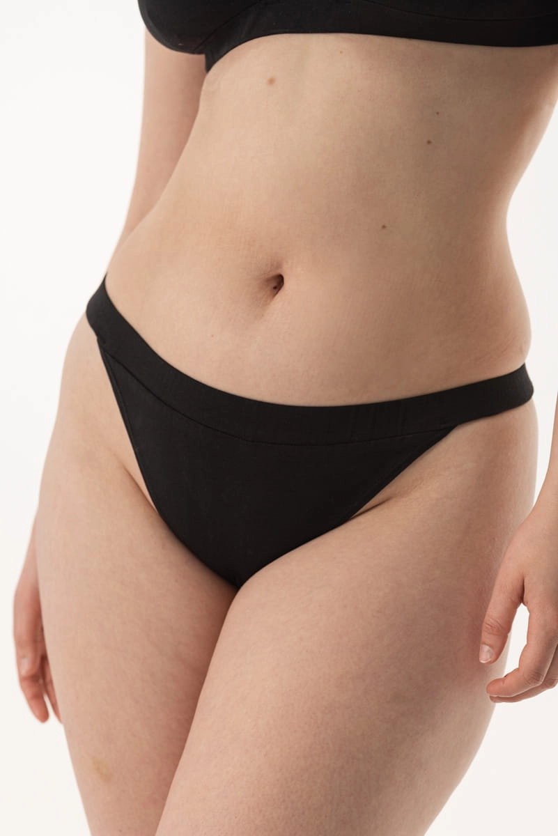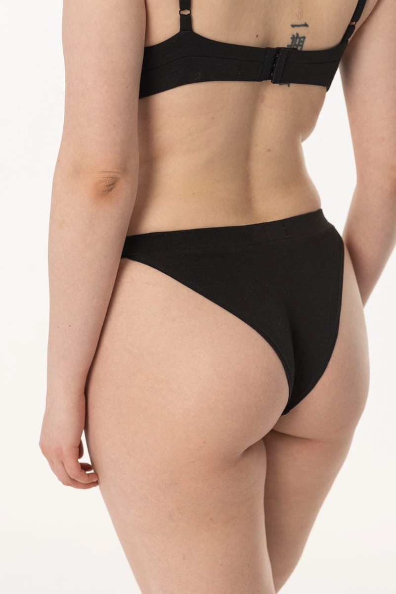 Figi FeelFree to uniwersalny, ale również bardzo kobiecy model z lekko podwyższonym stanem i mocnym wycięciem, które pięknie podkreśli pupę i wydłuży optycznie nogi. Cienkie, bardzo miękko wykończone brzegi nogawek idealnie dopasowują się do sylwetki i zapewniają wysoki komfort noszenia. Delikatna gumka sprawia, że figi FeelFree są mniej widoczne pod ubraniem i nie odznaczają się przy noszeniu obcisłych dołów. Czarne figi FeelFree uszyliśmy z bawełny z włókien organicznych, wyprodukowanej we Włoszech specjalnie na nasze zamówienie. Dla Ciebie to gwarancja, że nosisz na sobie wyjątkowo miękką, ekologiczną, a przy tym całkowicie bezpieczną dzianinę. To po prostu najlepszy materiał na bieliznę, jaki możesz sobie wyobrazić.