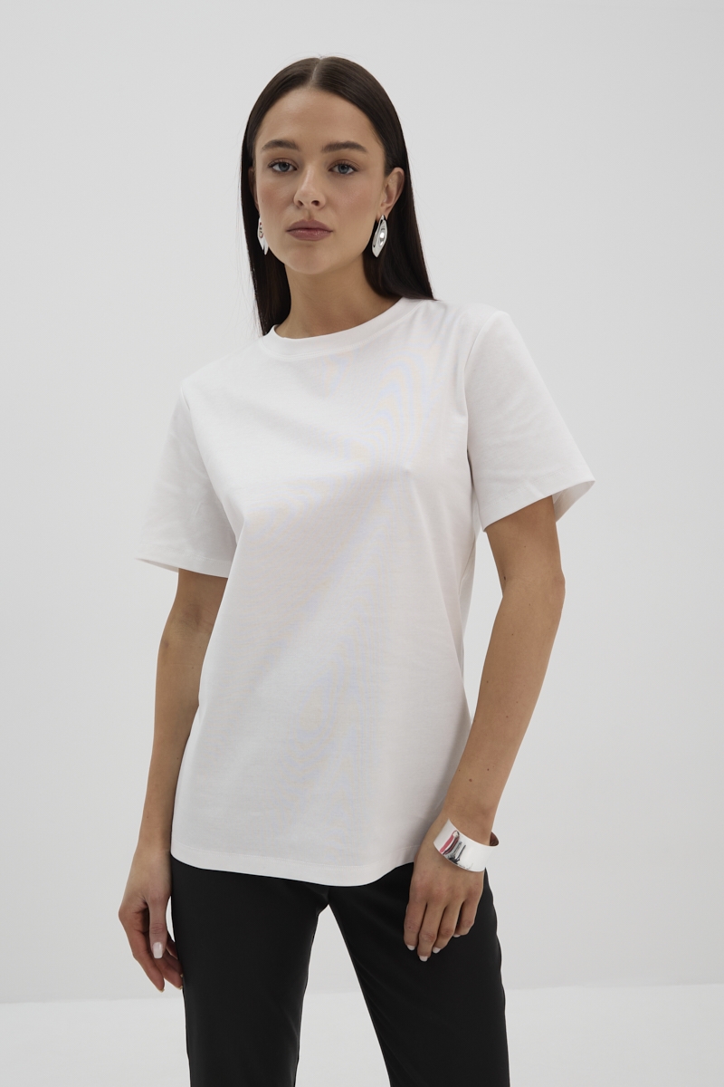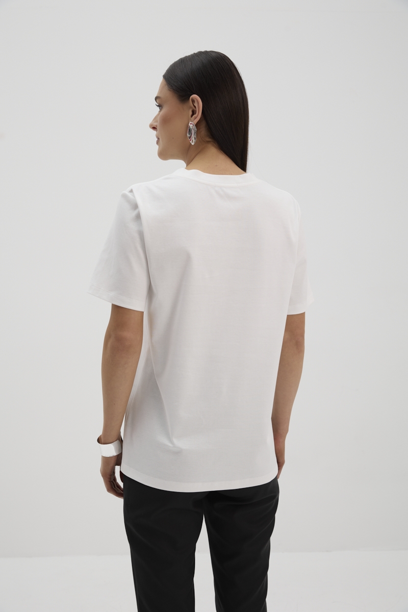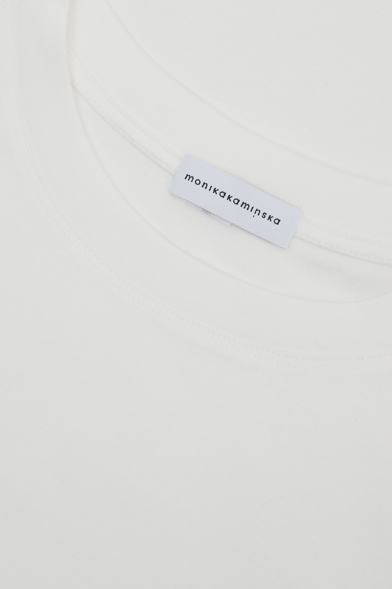 Konstrukcja opiera się na klasycznym kroju z krótkim rękawem i dekoltem o-neck. Wewnętrzny potnik wzmacnia linię dekoltu, dzięki czemu pozostaje on schludny i odporny na odkształcenia w codziennym użytkowaniu. Całość została uszyta z naciskiem na precyzyjne, czyste wykończenia.