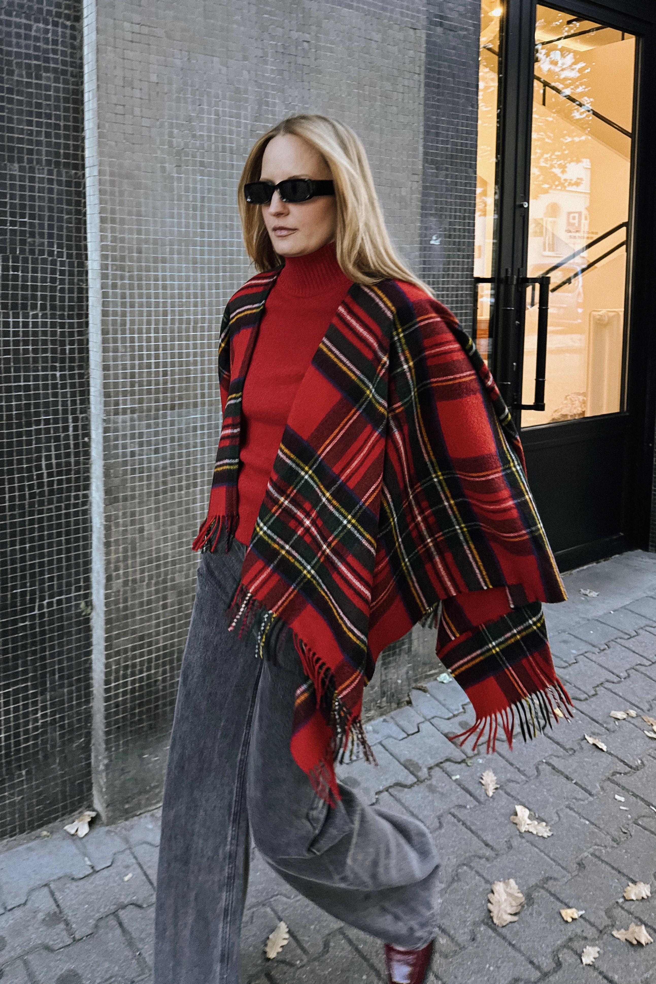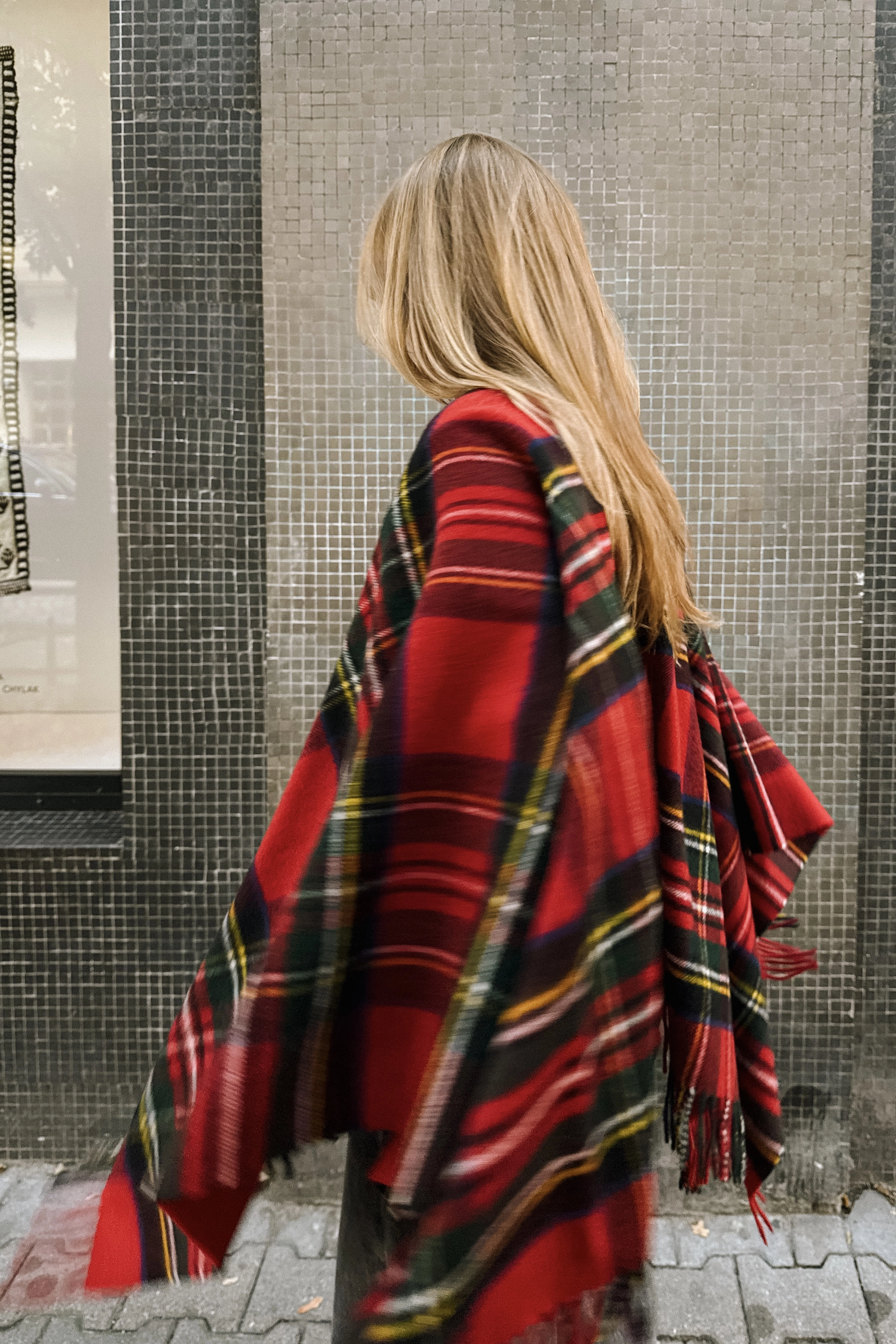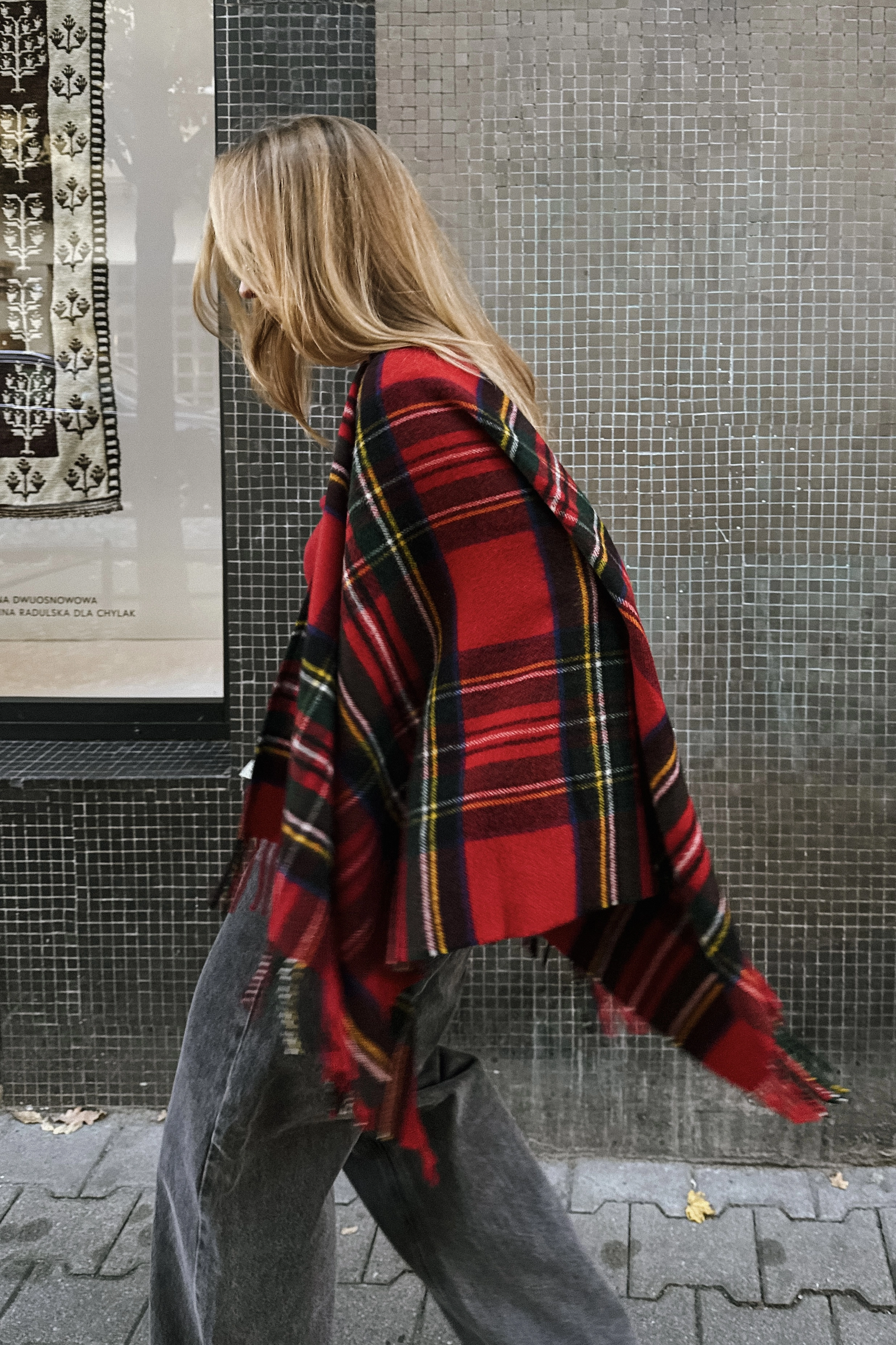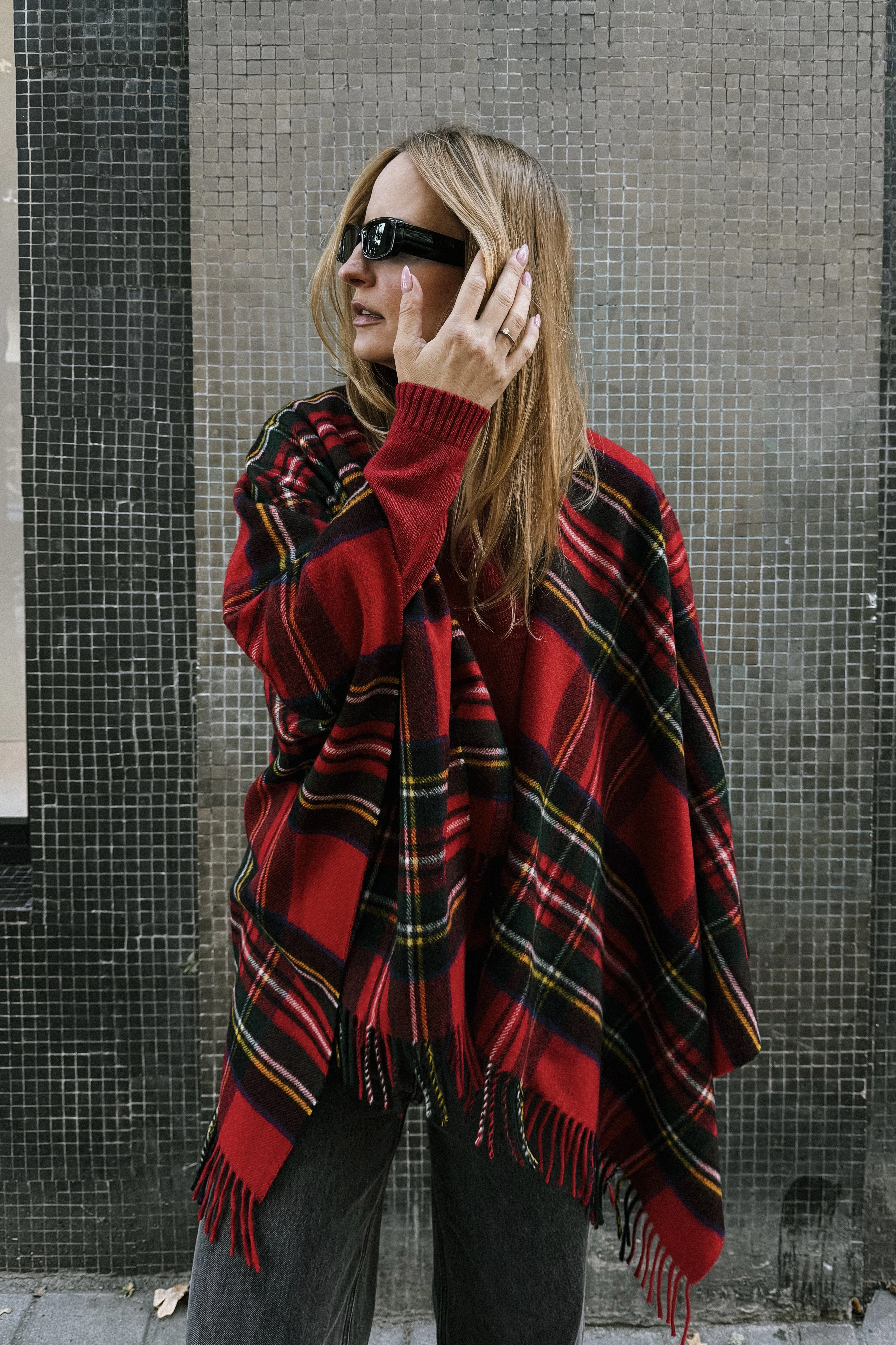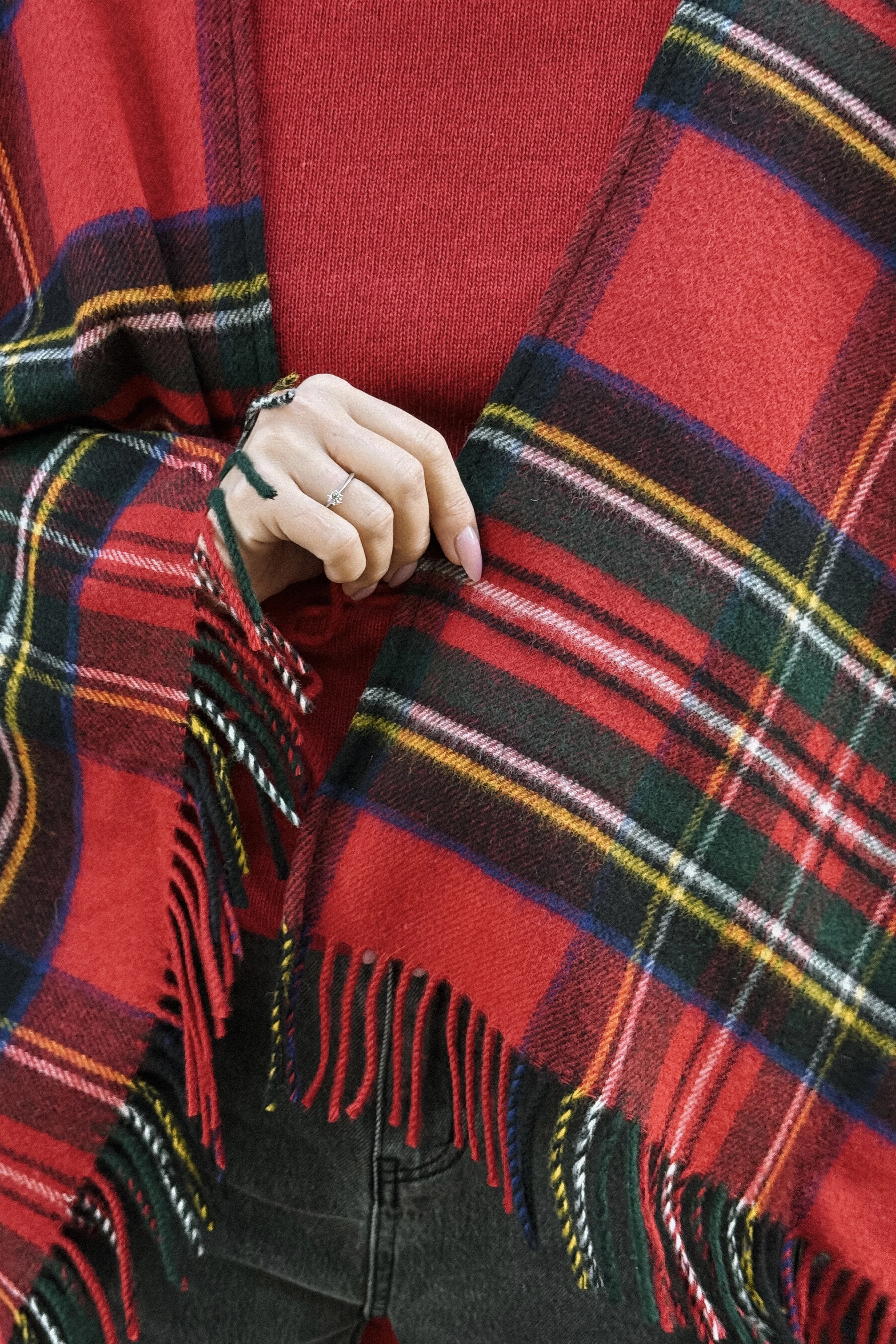 Duże ponczo z frędzlami to wyjątkowy dodatek, który łączy w sobie elegancję, wygodę i odrobinę artystycznego luzu. Jego klasyczny wzór w kratę na tle głębokiej czerwieni, przełamany zielono-żółtymi akcentami, tworzy harmonijną i wyrazistą kompozycję kolorów. To ponczo, które nie tylko ogrzewa, ale też przyciąga spojrzenia – idealne dla osób, które lubią wyróżniać się z tłumu.