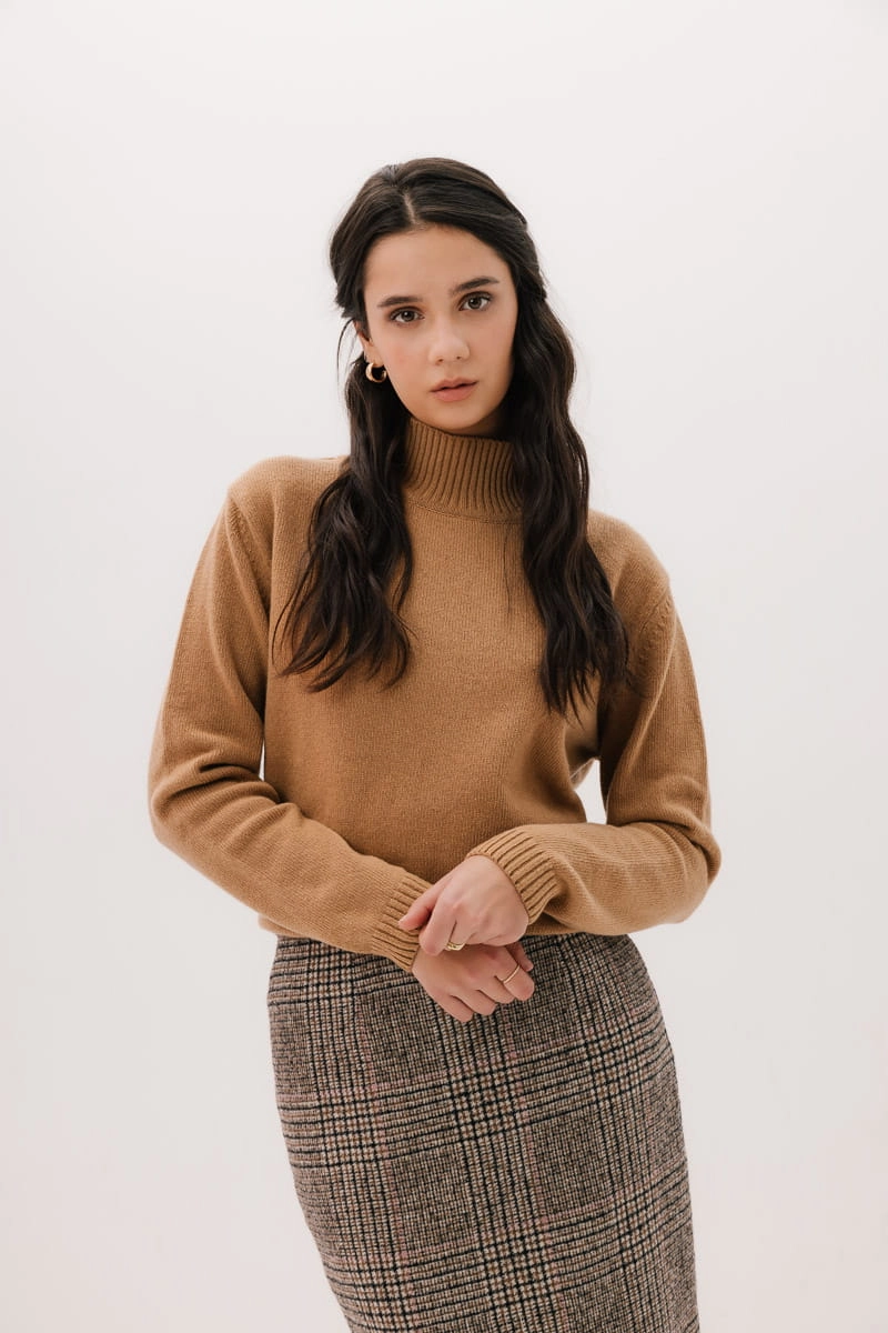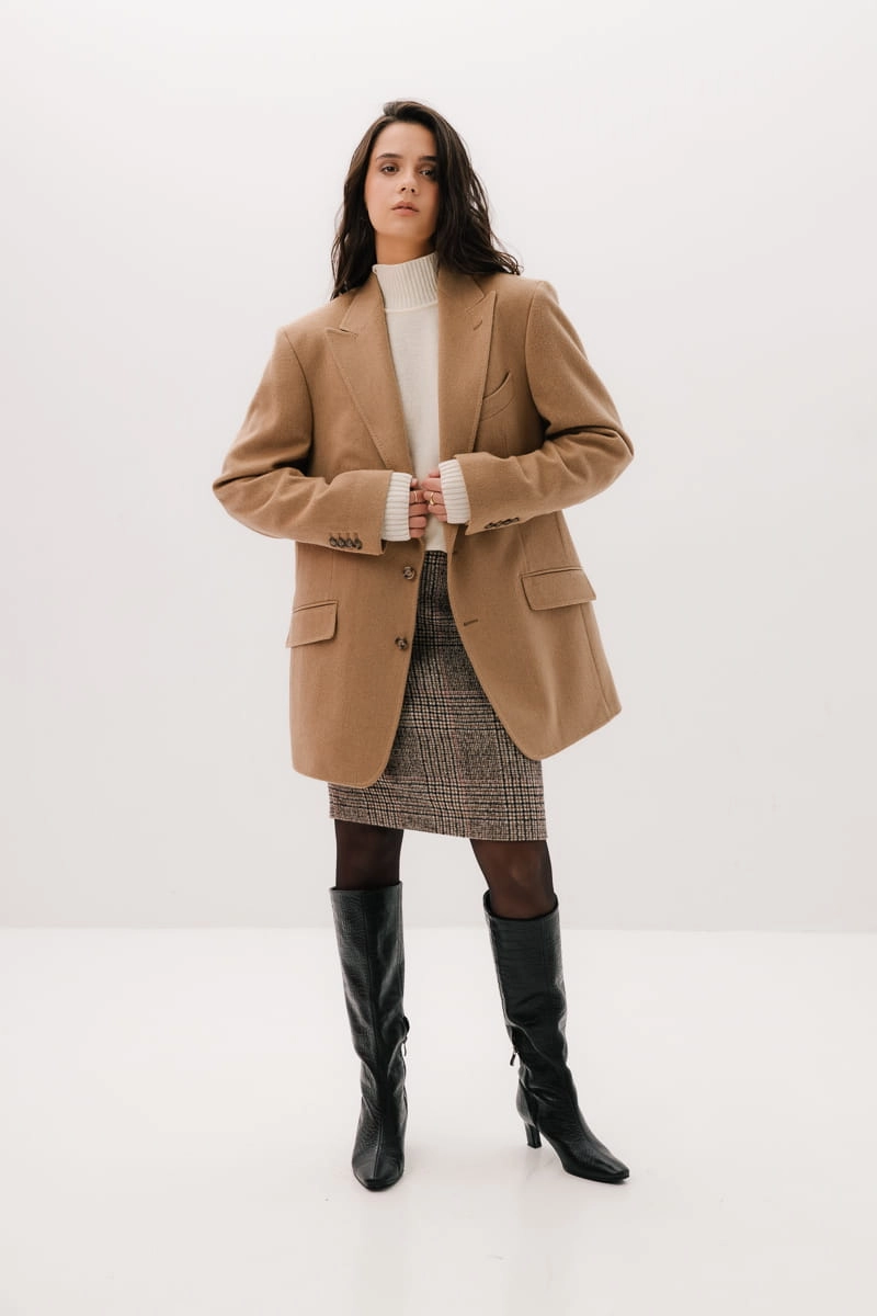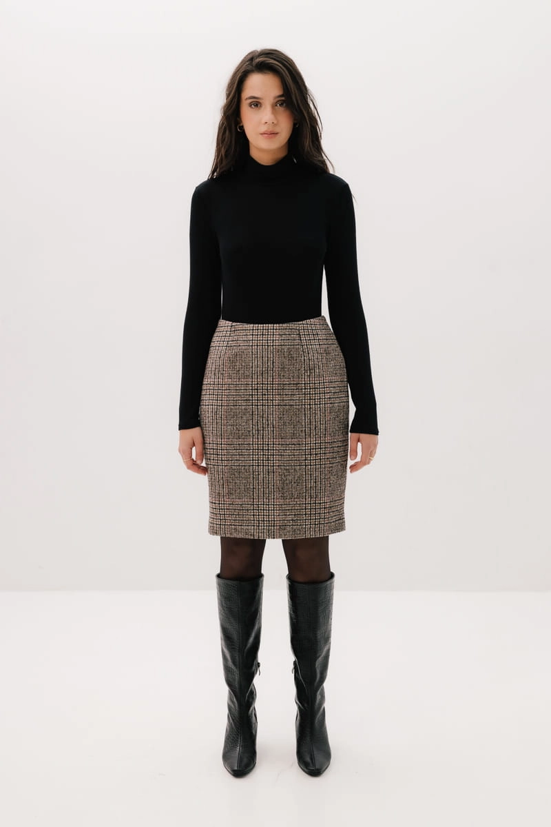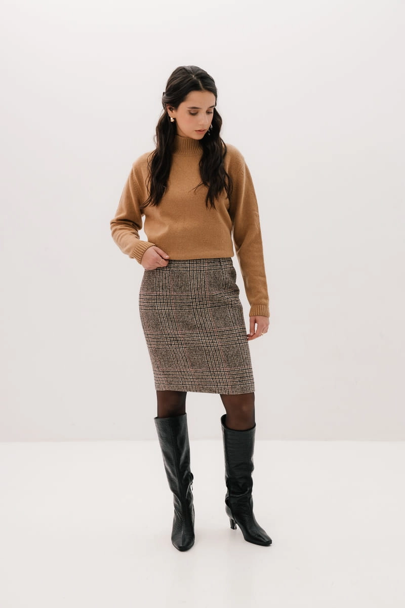 Spódnica wełniana ołówkowa Fable, beżowa kratka