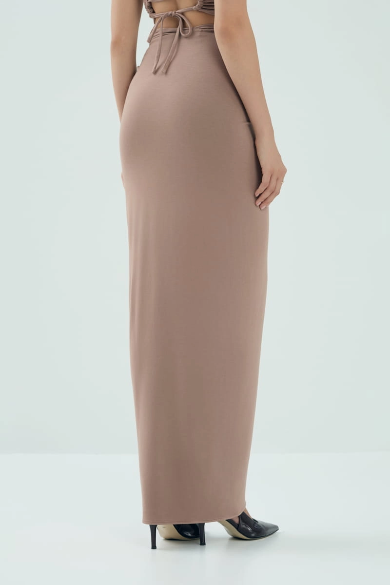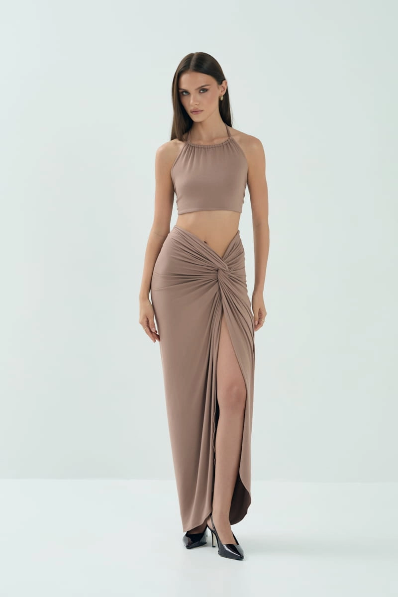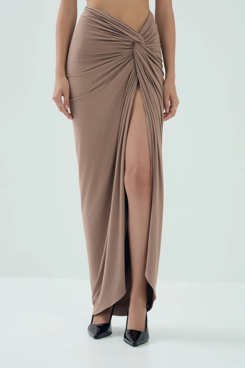 Długa spódnica, która lekko dopasowuje się do sylwetki i dobrze układa się w ruchu. Rozcięcie z boku delikatnie odsłania nogę i dodaje całości lekkości. Na wysokości bioder materiał zbiera się w charakterystyczny skręt, który podkreśla talię i dodaje ciekawego akcentu. Sprawdza się jako baza codziennych stylizacji, ale z odpowiednimi dodatkami z łatwością zmieni się w wieczorowy look.