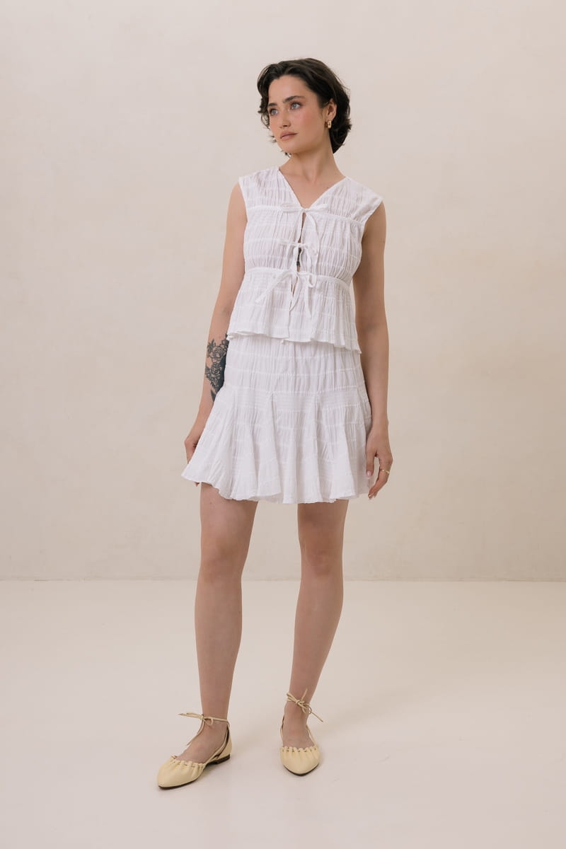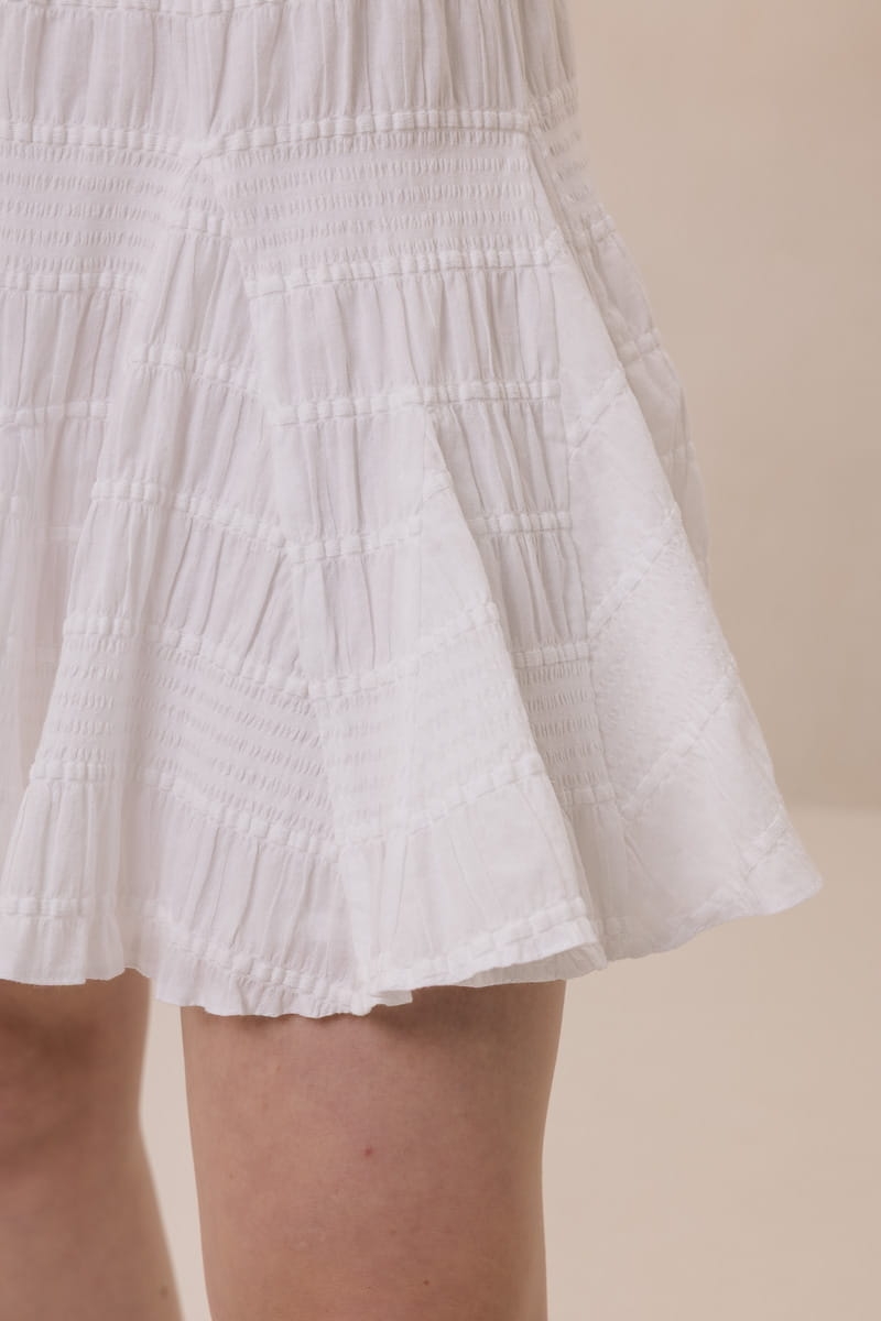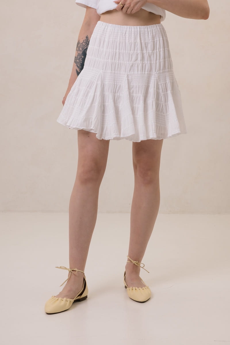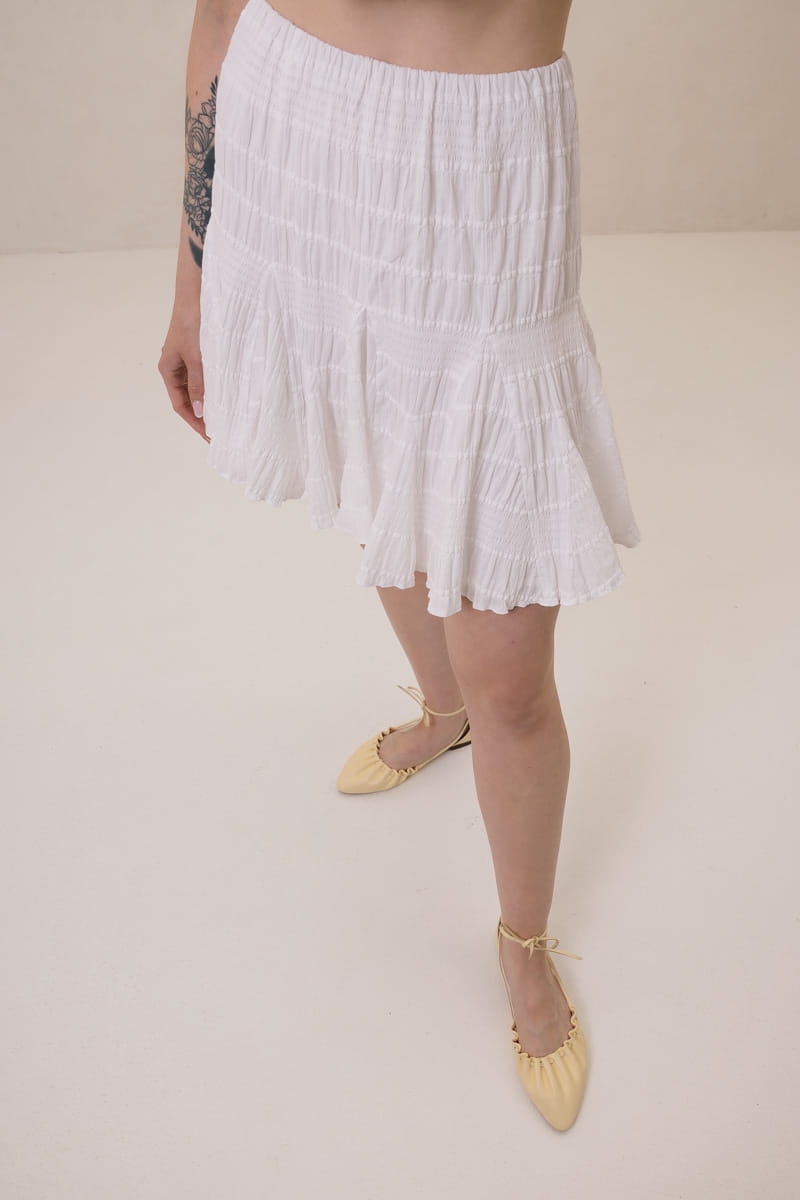 Mini spódniczka z godetami — lekko rozkloszowana, z pięknie układającymi się kontrafałdami, które dodają jej objętości i dziewczęcego charakteru. Szeroka guma w talii sprawia, że idealnie dopasowuje się do sylwetki, podkreślając jej atuty i gwarantując wygodę noszenia przez cały dzień. Uszyta z dbałością o detale, posiada delikatną, wiskozową podszewkę, dzięki której świetnie się układa i nie prześwituje.