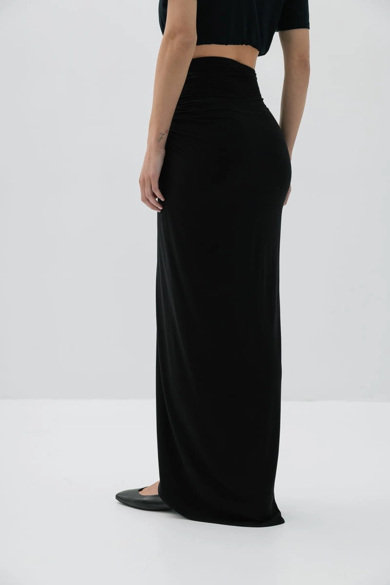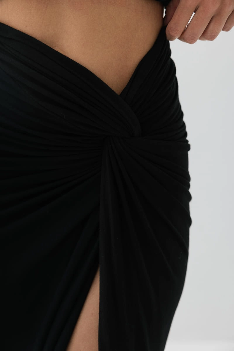 Długa spódnica, która lekko dopasowuje się do sylwetki i dobrze układa się w ruchu. Rozcięcie z boku delikatnie odsłania nogę i dodaje całości lekkości. Na wysokości bioder materiał zbiera się w charakterystyczny skręt, który podkreśla talię i dodaje ciekawego akcentu. Sprawdza się jako baza codziennych stylizacji, ale z odpowiednimi dodatkami z łatwością zmieni się w wieczorowy look.