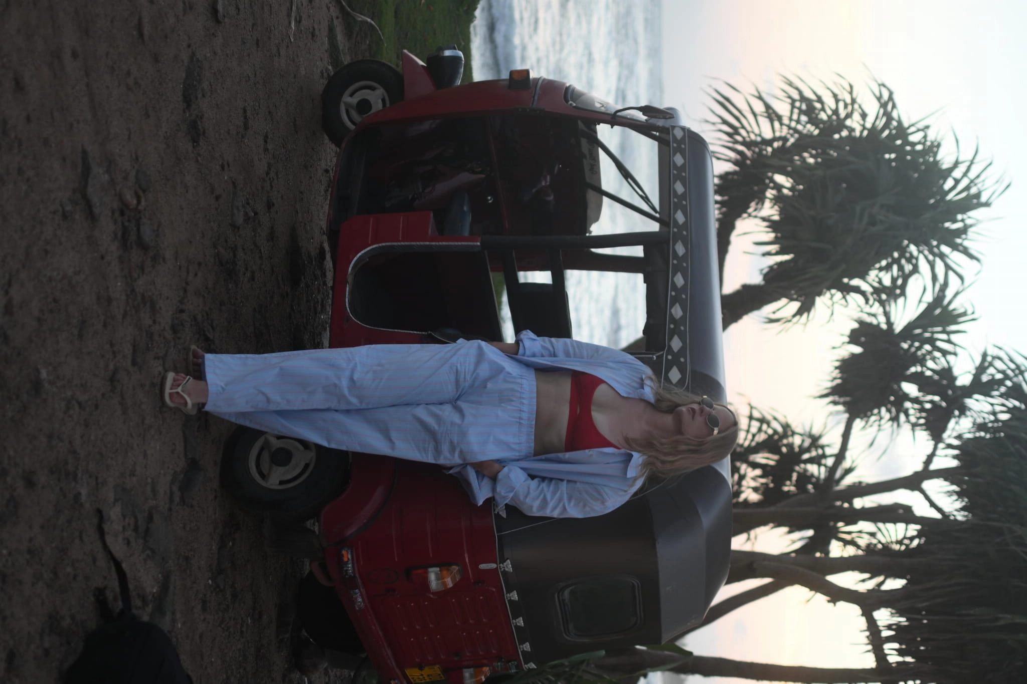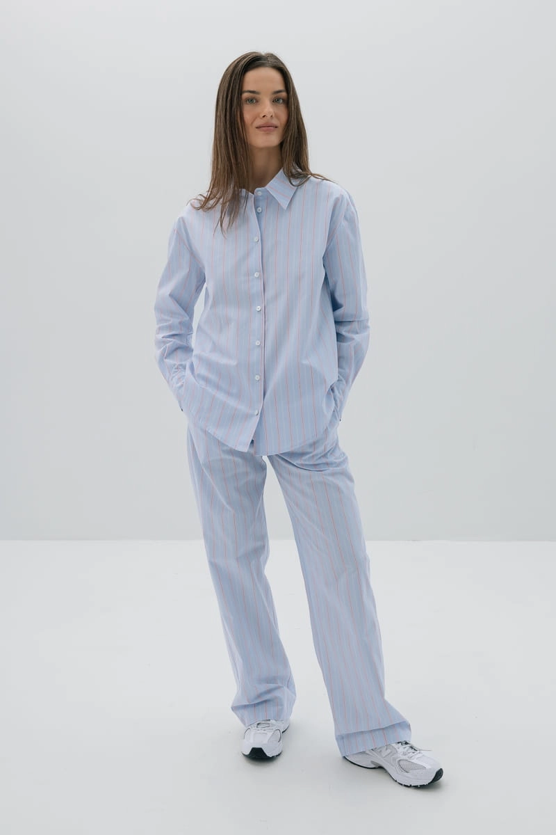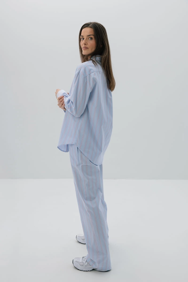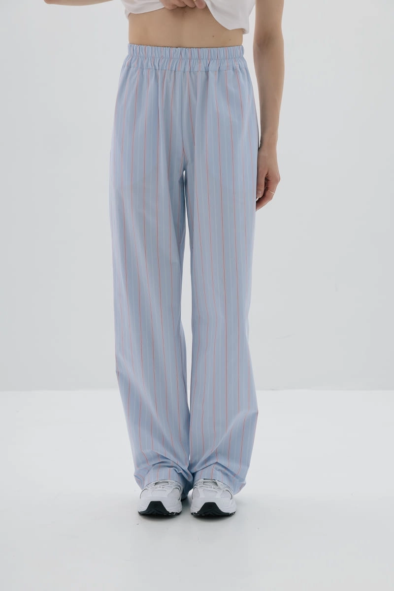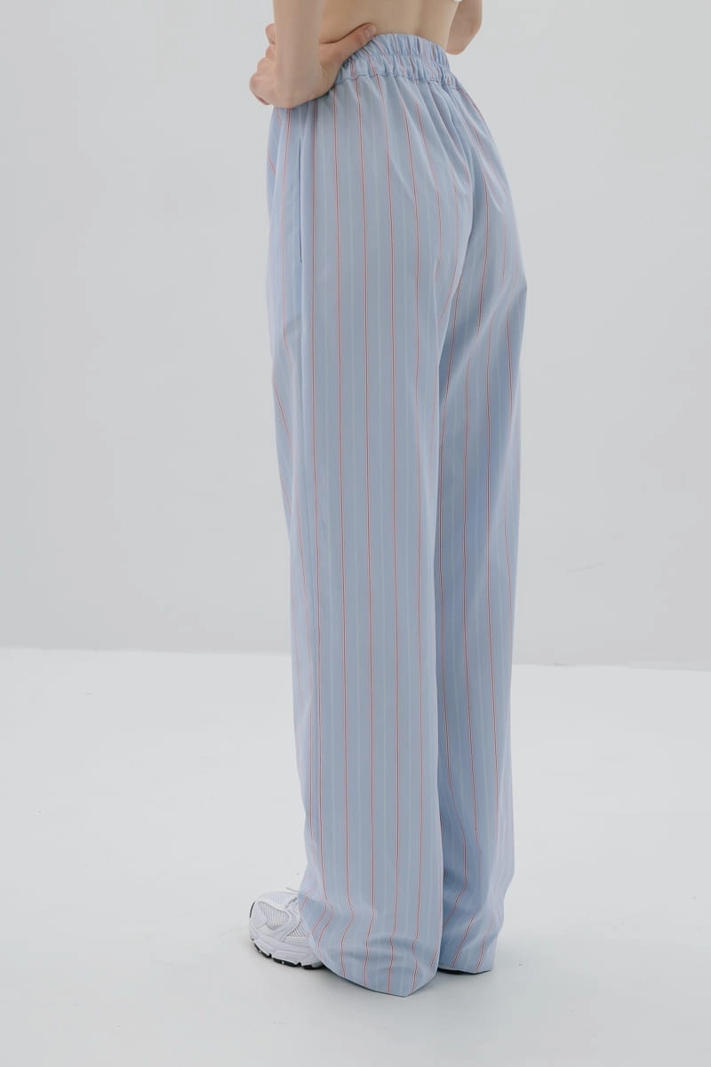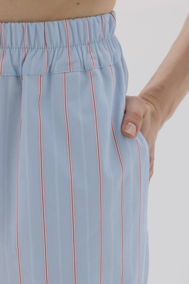Spodnie bawełniane Positano niebieskie w różowo-czerwone prążki