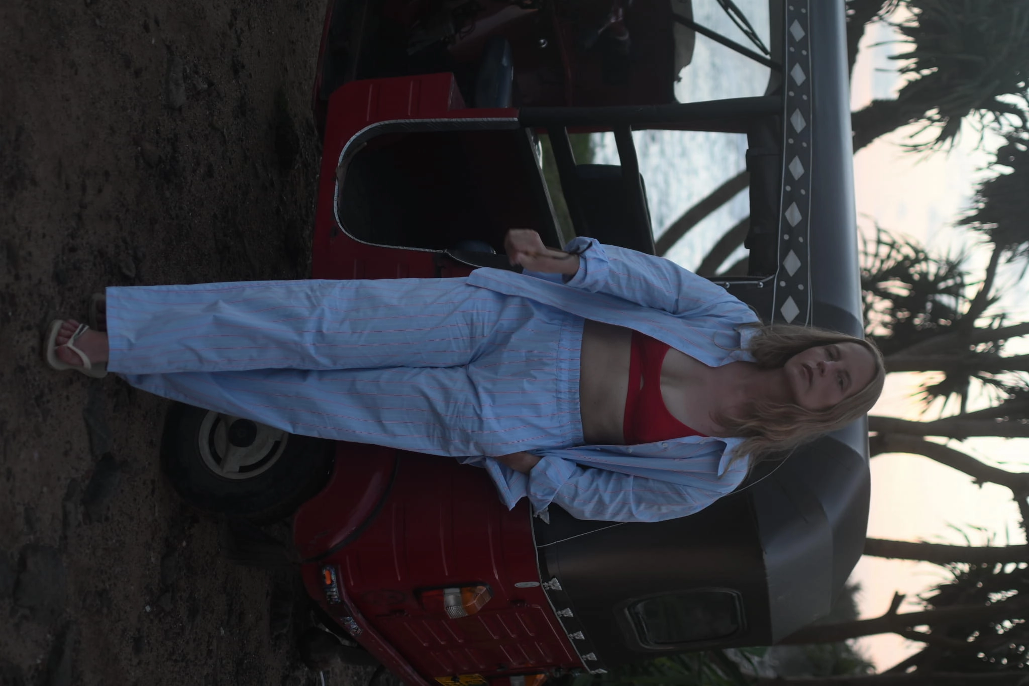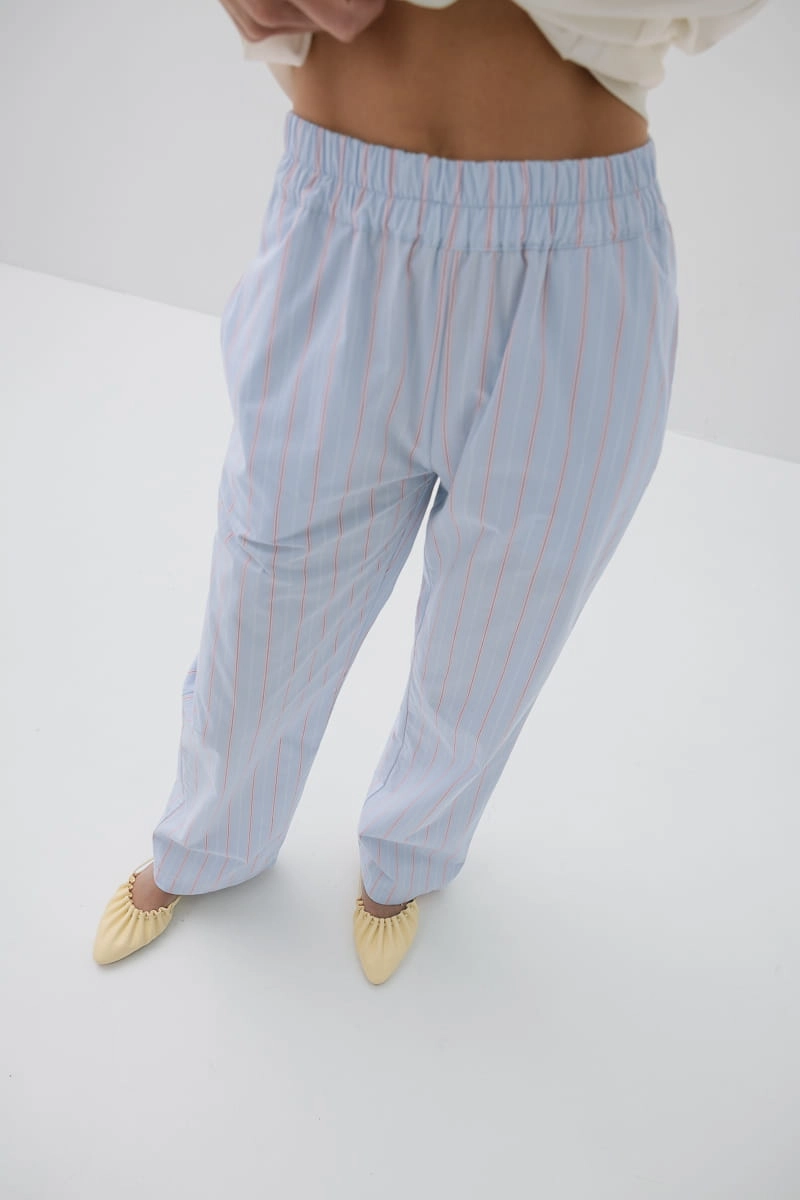 Spodnie bawełniane Positano, niebieskie w różowo-czerwone prązki