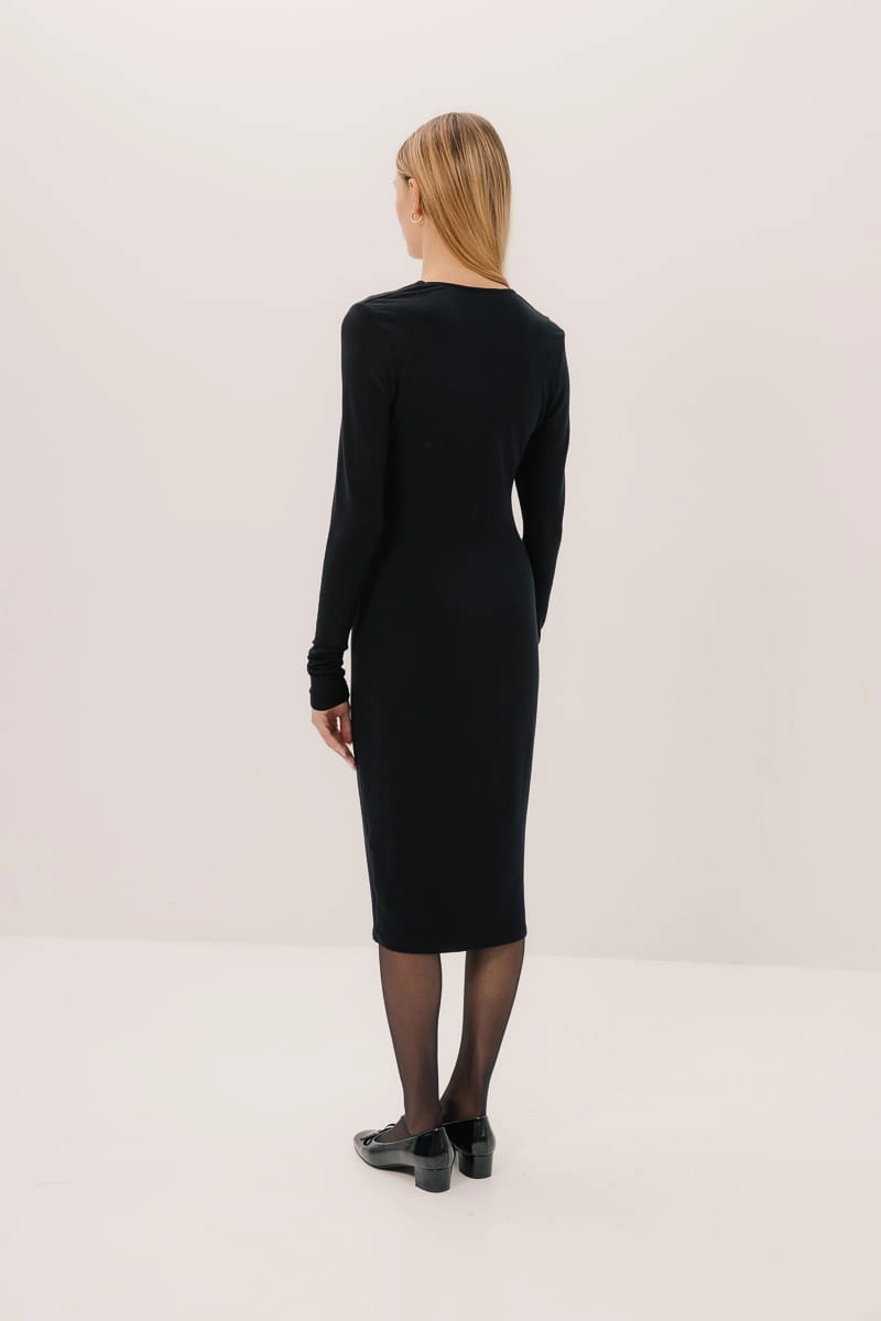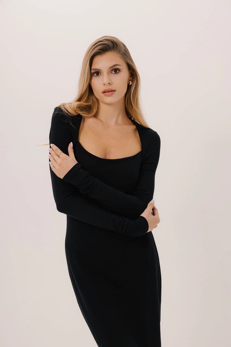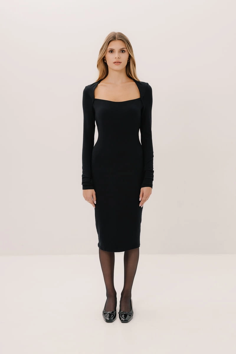 Cechą charakterystyczną modelu Porto są długie rękawy i dopasowany krój, który podkreśla sylwetkę, nadając jej szykownego charakteru. Wyróżnia ją asymetryczny element przypominający bolerko, który dodaje nowoczesnego i minimalistycznego akcentu. Kwadratowy dekolt delikatnie eksponuje obojczyki, dodając sukience subtelnego uroku i zmysłowości.