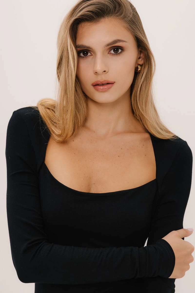 Modelka nr 1 ma 174 cm wzrostu i nosi rozmiar XS. Wymiary modelki: 83 cm biust, 64 cm talia, 88 cm.