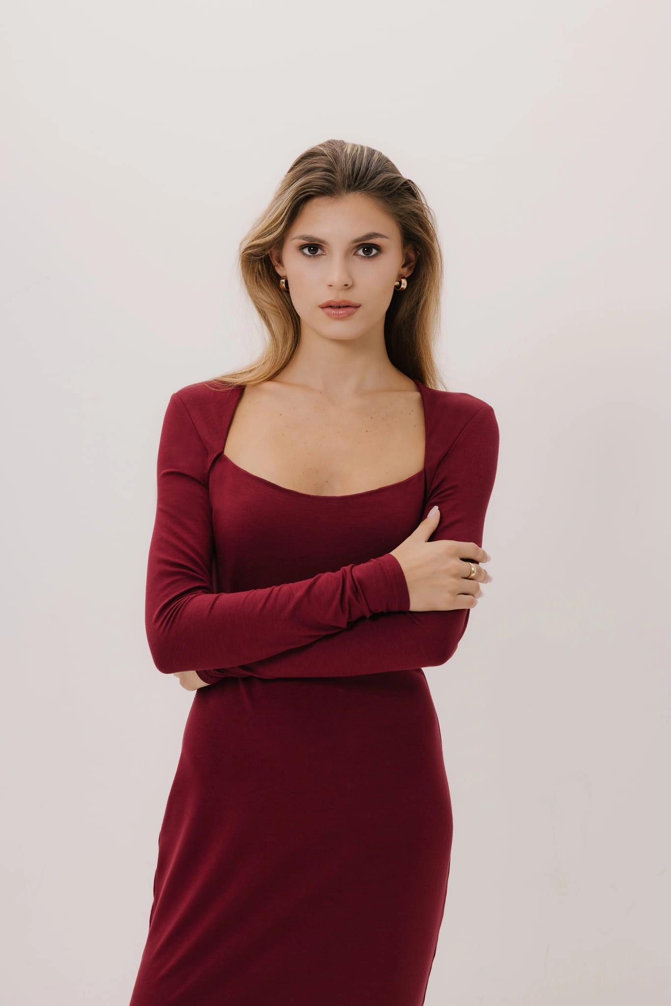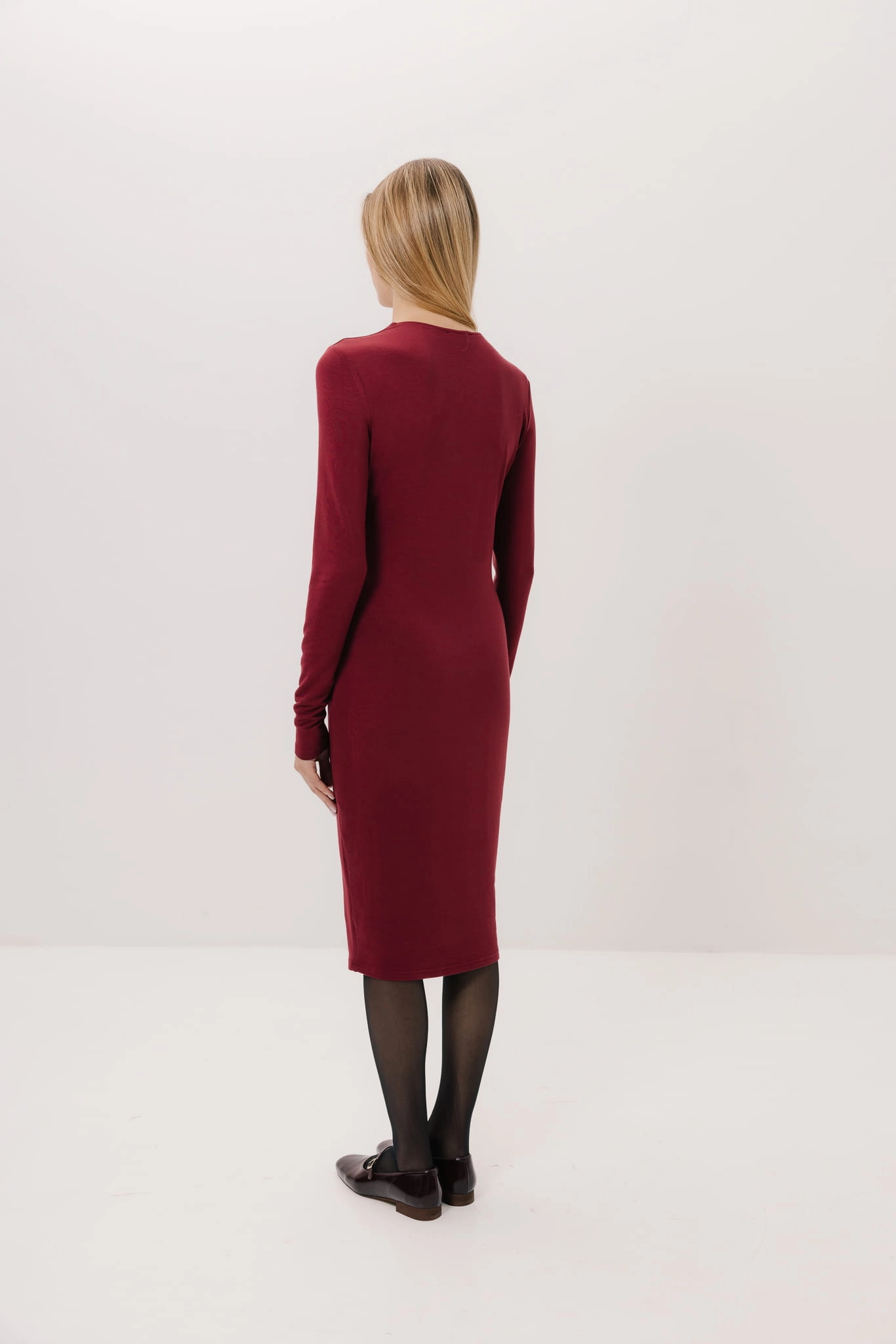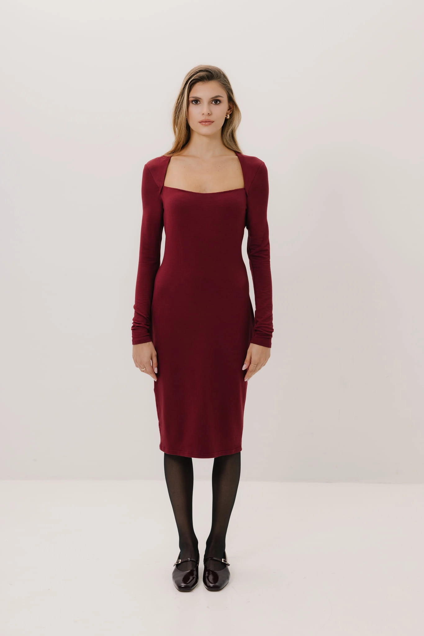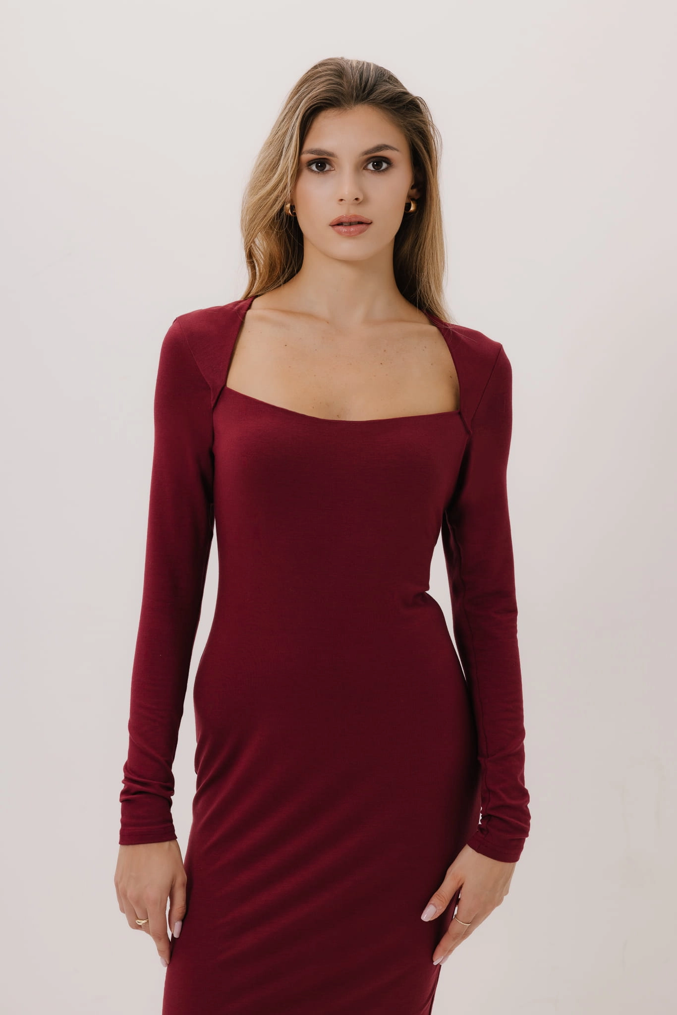 Model Porto wyróżnia się długimi rękawami i dopasowanym krojem, który podkreśla sylwetkę, nadając jej eleganckiego charakteru. Zastosowanie dekoracyjnego elementu w stylu bolerka dodaje sukience unikalności, a także nowoczesnego, minimalistycznego wyrazu. Kwadratowy dekolt subtelnie eksponuje obojczyki, dodając odrobiny zmysłowości.