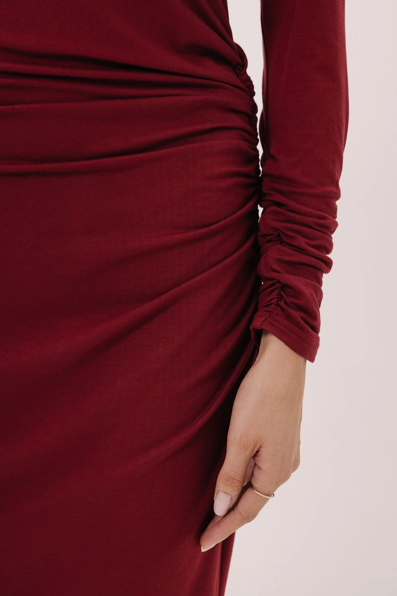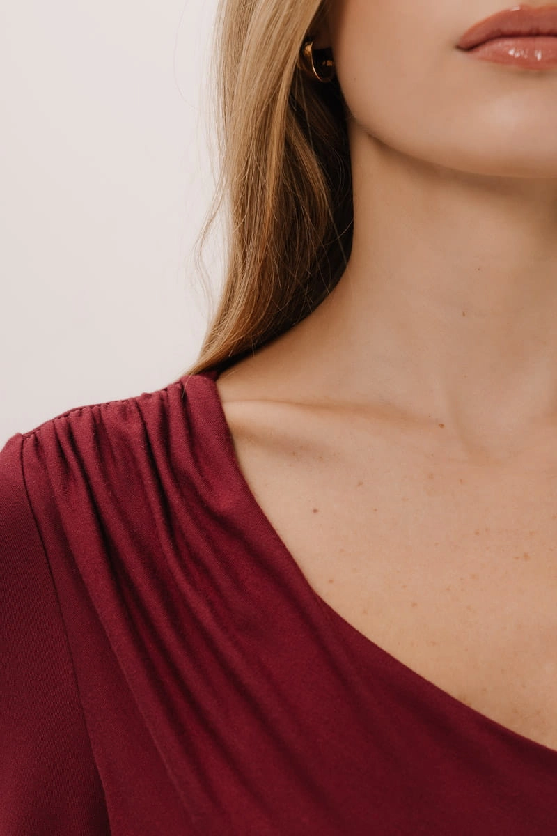 Jednak to, co naprawdę wyróżnia tę sukienkę, to marszczenia umieszczone w strategicznych miejscach – na ramieniu, talii oraz dolnej części sukienki. Marszczenia te podkreślają atuty sylwetki, sprawiając, że materiał delikatnie opływa ciało, tworząc efektowne, kobiece linie. Dzięki temu sukienka nie tylko doskonale leży, ale także modeluje sylwetkę, dodając pewności siebie i elegancji.