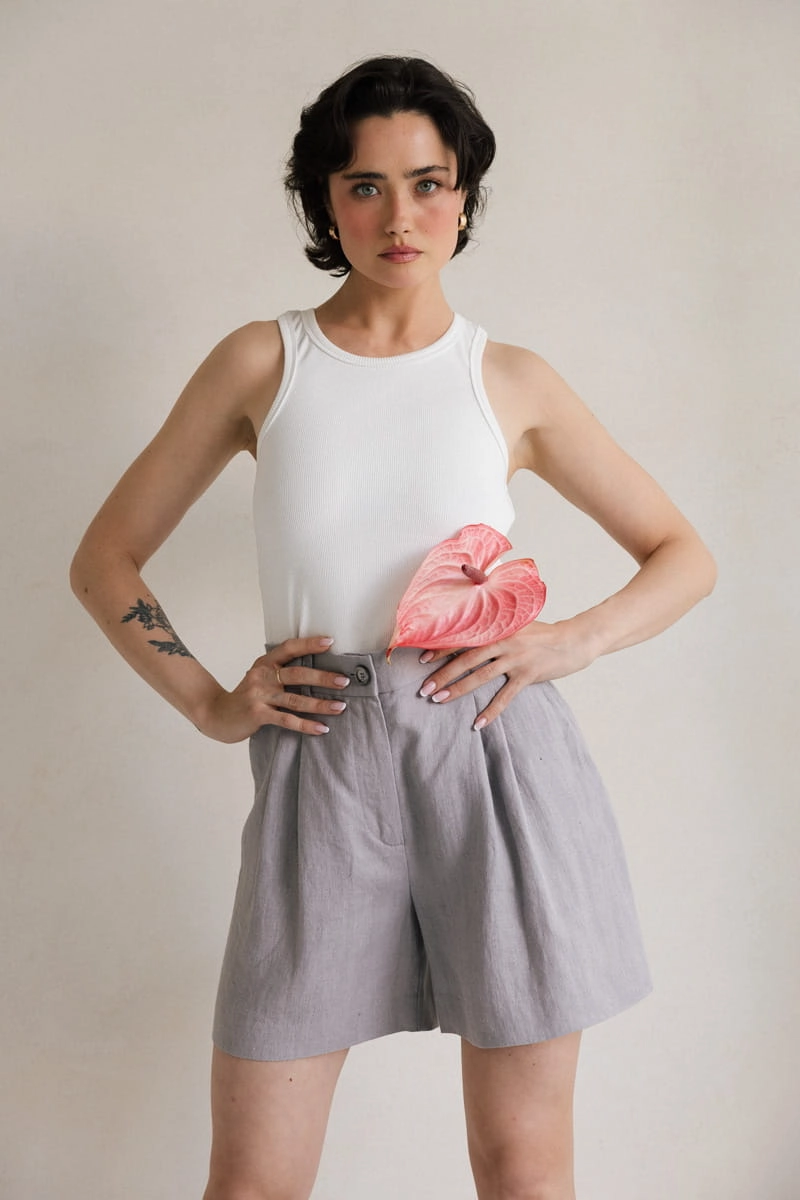 Szorty z zakładkami to absolutny must-have na letnie dni! Ich luźny, swobodny krój nie tylko zapewnia wygodę, ale też pięknie podkreśla sylwetkę, delikatnie akcentując talię i wysmuklając nogi.