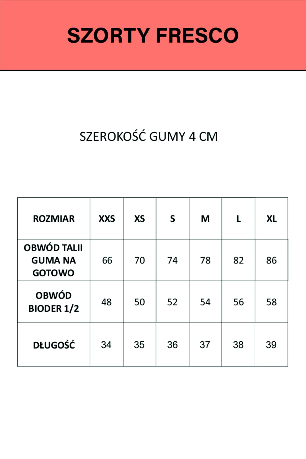 Modelka ma 172 cm wzrostu i szorty w rozmiarze XS. Wymiary modelki: 83 cm biust, 63 cm talia, 92 cm biodra.