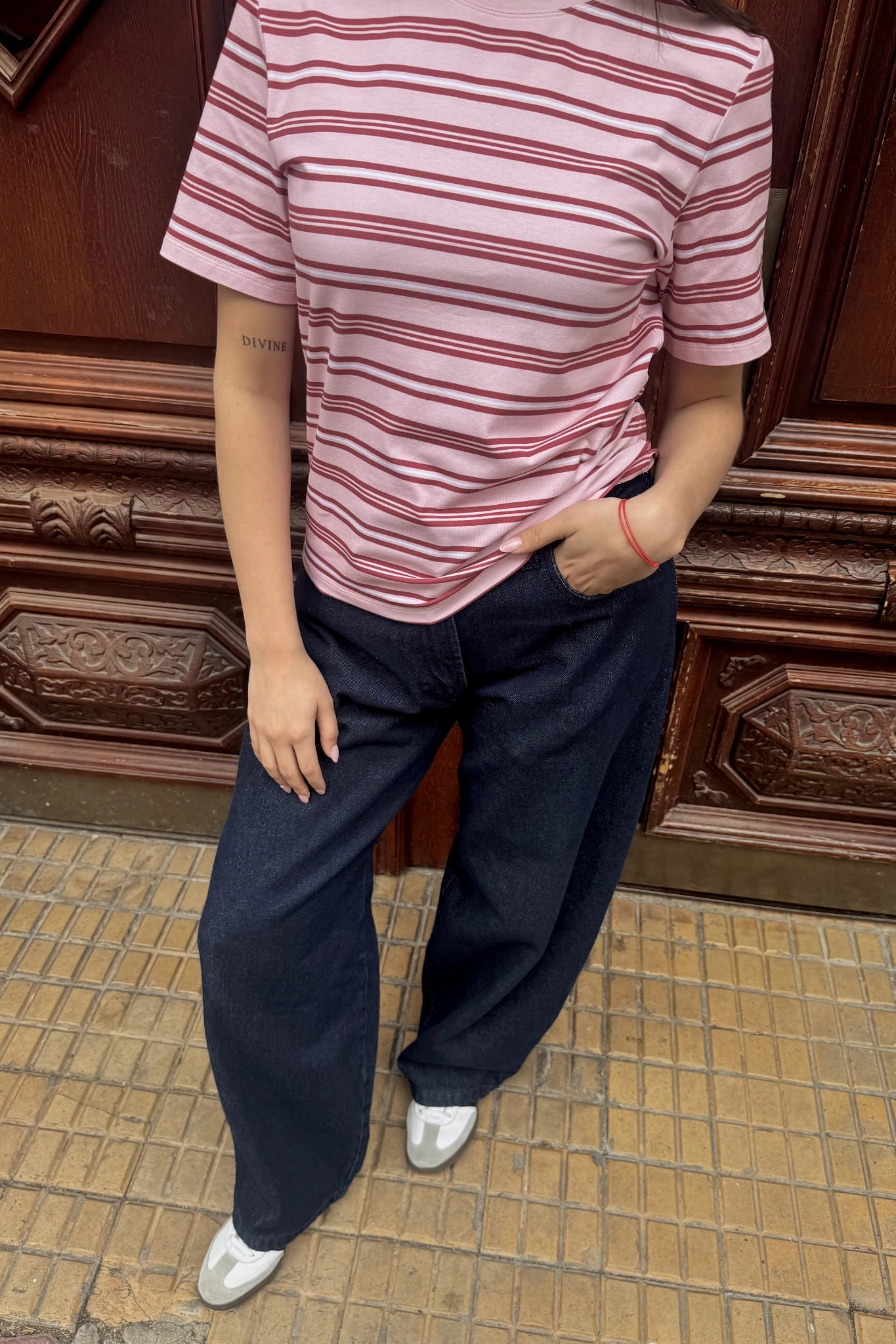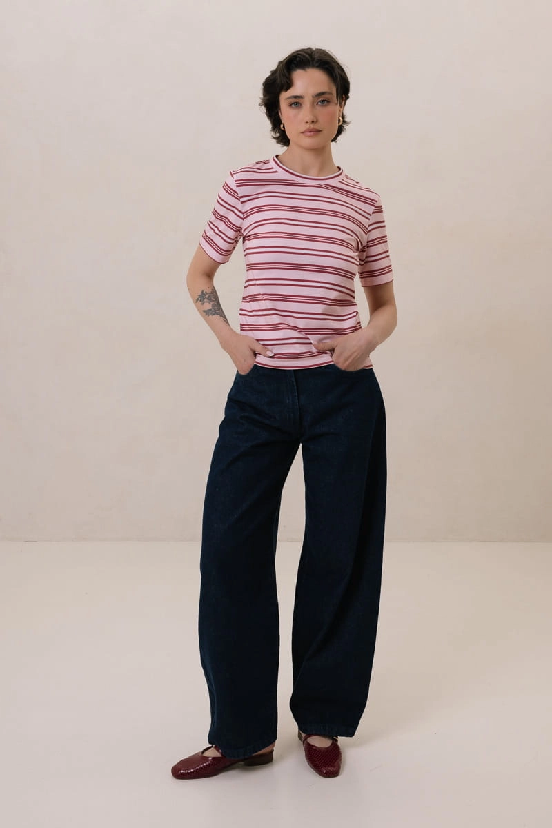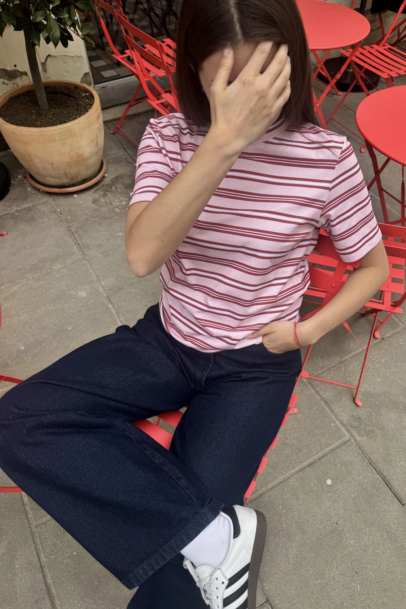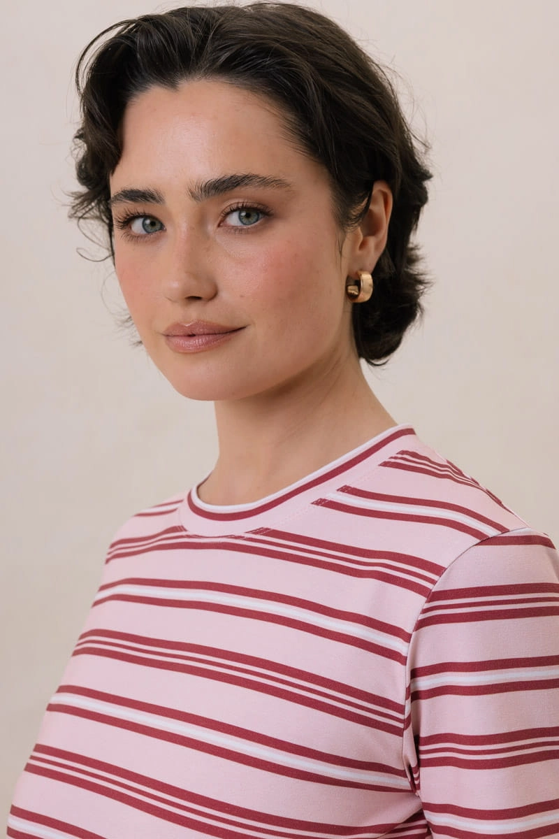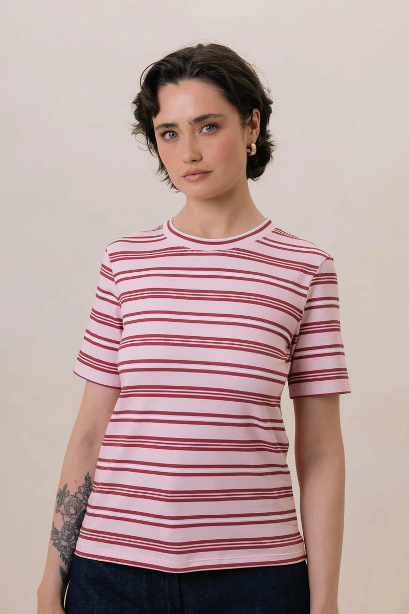 T-shirt w paski o prostym, klasycznym kroju. Wykonany z miękkiej bawełny, która zapewnia wygodę przez cały dzień. Ma krótki rękaw i dekolt wykończony gładką plisą. Pasuje zarówno do jeansów, jak i pod marynarkę czy sweter. Sprawdzi się w wielu codziennych stylizacjach.
