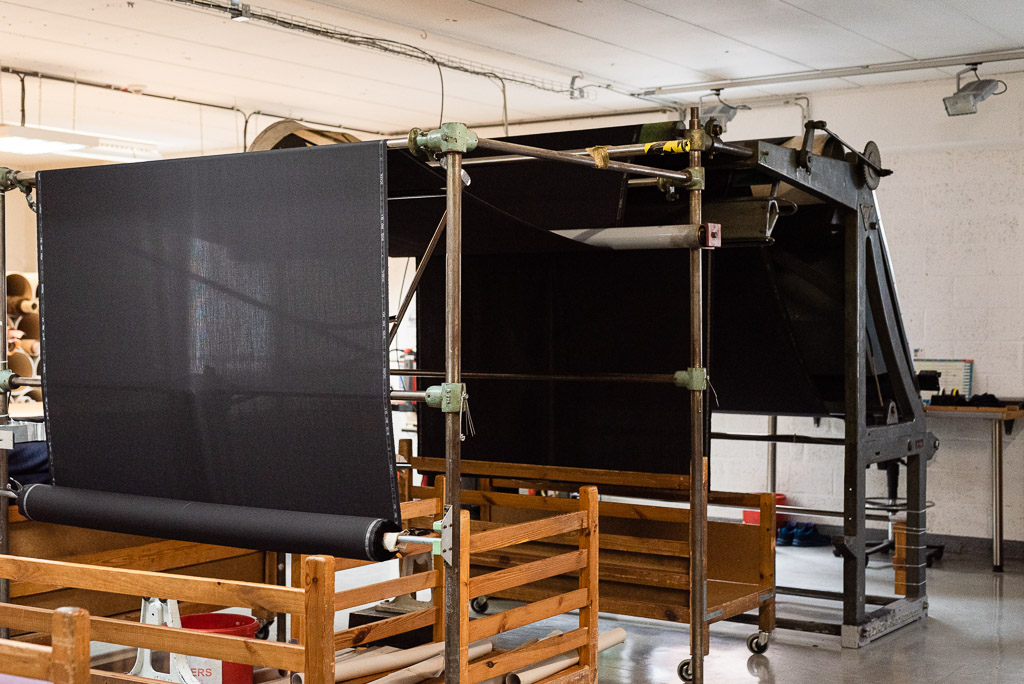 Poniżej widzicie tkaniny zawinięte w belki. Kiedy na przykład zamawiasz garnitur, to z takiej belki odcina się 3 m tkaniny, a następnie wysyła do szwalni. Zwróć uwagę na to, jak są idealnie złożone. Nawet przechowywanie tkanin ma w sobie wysublimowany porządek.