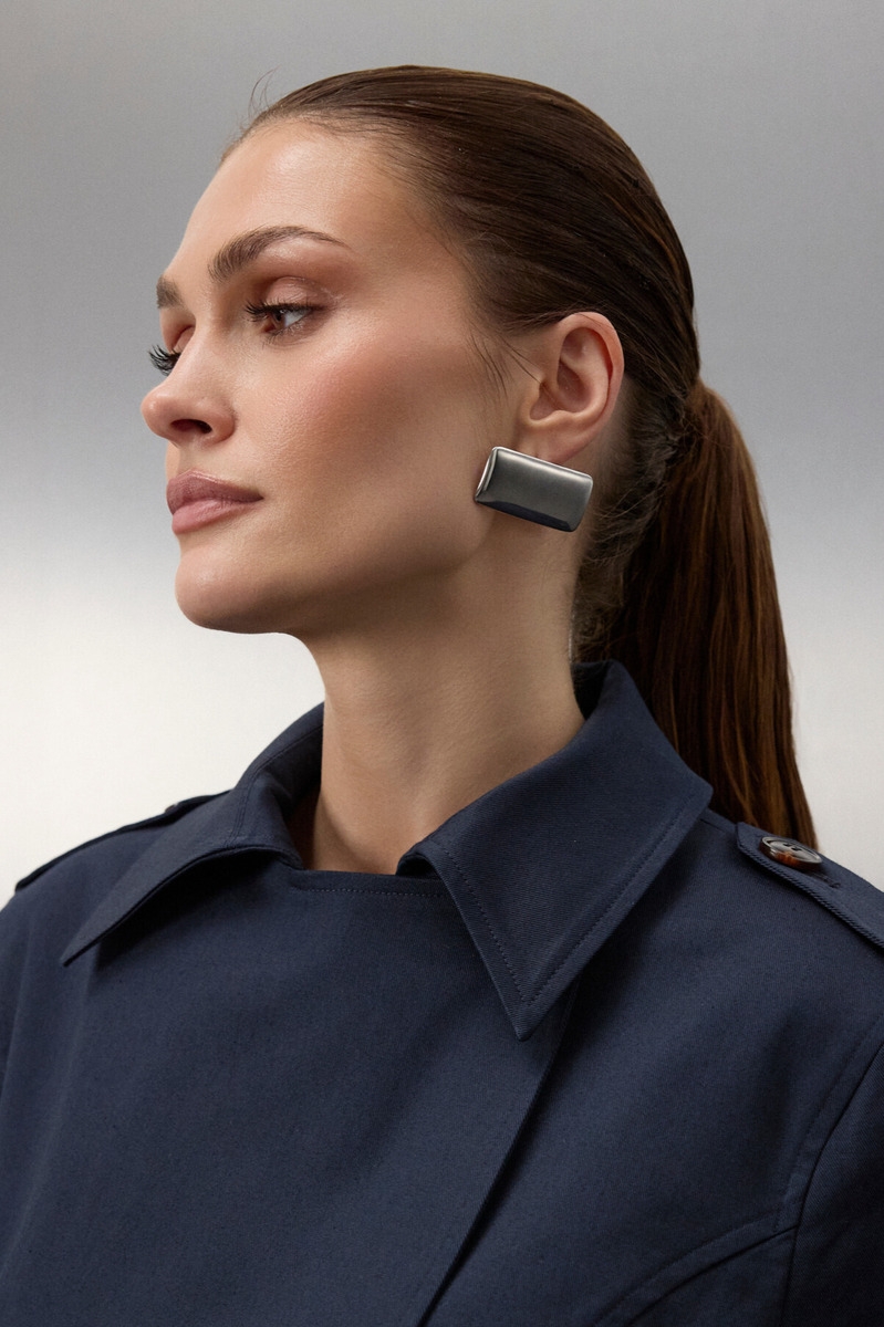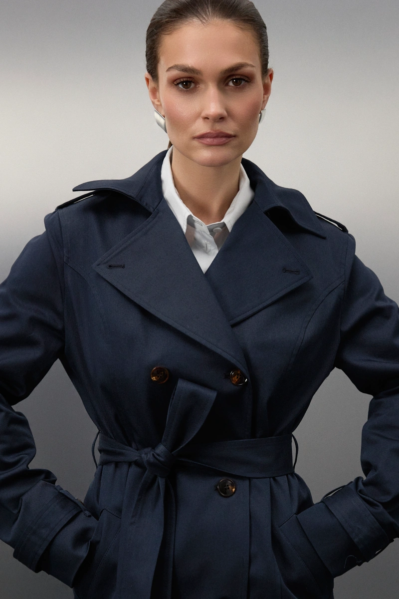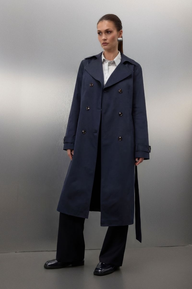 Trencz Bridget został wykonany z bawełnianej tkaniny płaszczowej o zwartej strukturze, która dobrze utrzymuje formę i podkreśla konstrukcję. Materiał zapewnia odpowiednią sztywność, dzięki czemu kołnierz, klapy i ramiona zachowują swój kształt podczas noszenia.